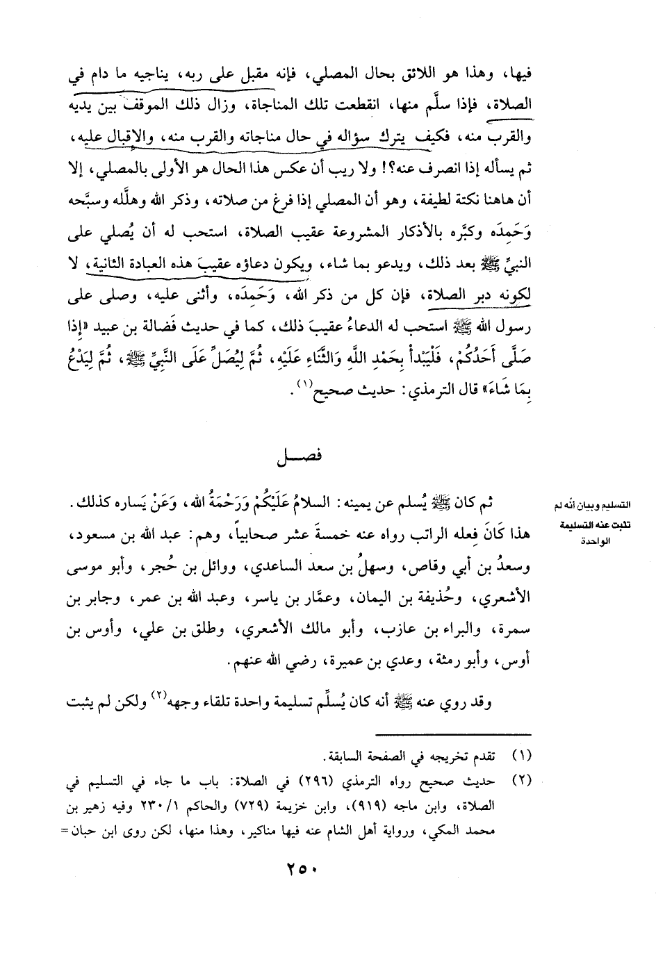 فِيهَا، وَهَذَا هُوَ اللَّائِقُ بِحَالِ الْمُصَلِّي، فَإِنَّهُ مُقْبِلٌ عَلَى رَبِّهِ، يُنَاجِيهِ مَا دَامَ فِي الصَّلَاةِ، فَإِذَا سَلَّمَ مِنْهَا انْقَطَعَتْ تِلْكَ الْمُنَاجَاةُ، وَزَالَ ذَلِكَ الْمَوْقِفُ بَيْنَ يَدَيْهِ وَالْقُرْبُ مِنْهُ، فَكَيْفَ يَتْرُكُ سُؤَالَهُ فِي حَالِ مُنَاجَاتِهِ وَالْقُرْبِ مِنْهُ وَالْإِقْبَالِ عَلَيْهِ، ثُمَّ يَسْأَلُهُ إِذَا انْصَرَفَ عَنْهُ؟ وَلَا رَيْبَ أَنَّ عَكْسَ هَذَا الْحَالِ هُوَ الْأَوْلَى بِالْمُصَلِّي، إِلَّا أَنَّ هَاهُنَا نُكْتَةً لَطِيفَةً، وَهُوَ أَنَّ الْمُصَلِّيَ إِذَا فَرَغَ مِنْ صَلَاتِهِ وَذَكَرَ اللَّهَ وَهَلَّلَهُ وَسَبَّحَهُ وَحَمِدَهُ وَكَبَّرَهُ بِالْأَذْكَارِ الْمَشْرُوعَةِ عَقِيبَ الصَّلَاةِ، اسْتُحِبَّ لَهُ أَنْ يُصَلِّيَ عَلَى النَّبِيِّ صَلَّى اللَّهُ عَلَيْهِ وَسَلَّمَ بَعْدَ ذَلِكَ، وَيَدْعُو بِمَا شَاءَ، وَيَكُونُ دُعَاؤُهُ عَقِيبَ هَذِهِ الْعِبَادَةِ الثَّانِيَةِ، لَا لِكَوْنِهِ دُبُرَ الصَّلَاةِ، فَإِنَّ كُلَّ مَنْ ذَكَرَ اللَّهَ وَحَمِدَهُ وَأَثْنَى عَلَيْهِ وَصَلَّى عَلَى رَسُولِ اللَّهِ صَلَّى اللَّهُ عَلَيْهِ وَسَلَّمَ اسْتُحِبَّ لَهُ الدُّعَاءُ عَقِيبَ ذَلِكَ، كَمَا فِي حَدِيثِ فَضَالَةَ بْنِ عُبَيْدٍ ( «إِذَا صَلَّى أَحَدُكُمْ فَلْيَبْدَأْ بِحَمْدِ اللَّهِ وَالثَّنَاءِ عَلَيْهِ، ثُمَّ لِيُصَلِّ عَلَى النَّبِيِّ صَلَّى اللَّهُ عَلَيْهِ وَسَلَّمَ، ثُمَّ لِيَدْعُ بِمَا شَاءَ» ) قَالَ الترمذي: حَدِيثٌ صَحِيحٌ.