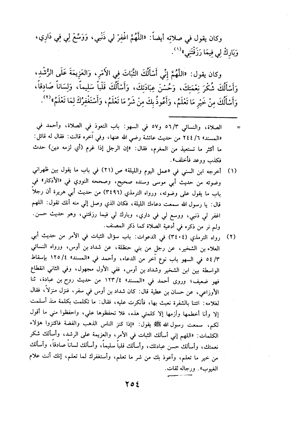 وَكَانَ يَقُولُ: ( «اللَّهُمَّ إِنِّي أَسْأَلُكَ الثَّبَاتَ فِي الْأَمْرِ، وَالْعَزِيمَةَ عَلَى الرُّشْدِ، وَأَسْأَلُكَ شُكْرَ نِعْمَتِكَ، وَحُسْنَ عِبَادَتِكَ، وَأَسْأَلُكَ قَلْبًا سَلِيمًا، وَلِسَانًا صَادِقًا، وَأَسْأَلُكَ مِنْ خَيْرِ مَا تَعْلَمُ، وَأَعُوذُ بِكَ مِنْ شَرِّ مَا تَعْلَمُ، وَأَسْتَغْفِرُكَ لِمَا تَعْلَمُ» ) .