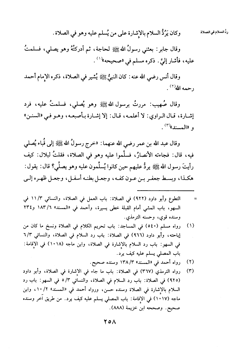 وَقَالَ صهيب: ( «مَرَرْتُ بِرَسُولِ اللَّهِ صَلَّى اللَّهُ عَلَيْهِ وَسَلَّمَ وَهُوَ يُصَلِّي، فَسَلَّمْتُ عَلَيْهِ فَرَدَّ إِشَارَةً» ) . قَالَ الرَّاوِي: لَا أَعْلَمُهُ قَالَ: إِلَّا إِشَارَةً بِأُصْبُعِهِ، وَهُوَ فِي " السُّنَنِ " وَ " الْمُسْنَدِ ".