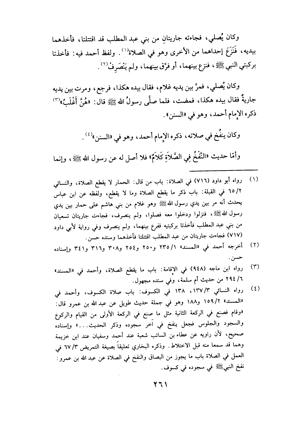 ( «وَكَانَ يُصَلِّي، فَجَاءَتْهُ جَارِيَتَانِ مِنْ بَنِي عَبْدِ الْمُطَّلِبِ قَدِ اقْتَتَلَتَا، فَأَخَذَهُمَا بِيَدَيْهِ، فَنَزَعَ إِحْدَاهُمَا مِنَ الْأُخْرَى وَهُوَ فِي الصَّلَاةِ» ) . وَلَفْظُ أحمد فِيهِ: ( «فَأَخَذَتَا بِرُكْبَتَيِ النَّبِيِّ صَلَّى اللَّهُ عَلَيْهِ وَسَلَّمَ، فَنَزَعَ بَيْنَهُمَا، أَوْ فَرَّقَ بَيْنَهُمَا وَلَمْ يَنْصَرِفْ» ) .