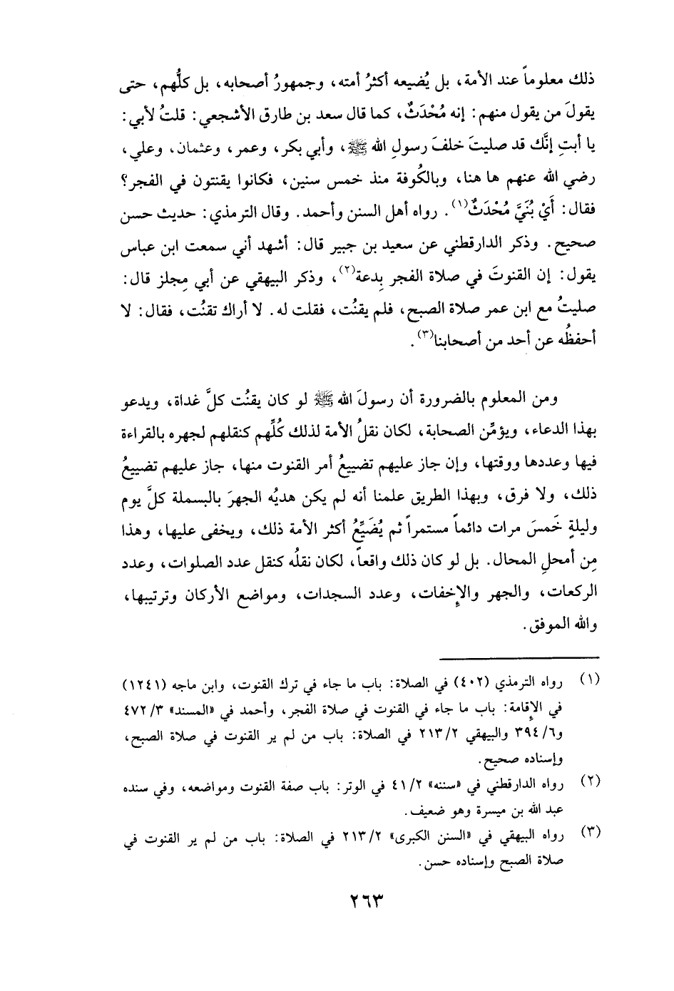 ذَلِكَ مَعْلُومًا عِنْدَ الْأُمَّةِ، بَلْ يُضَيِّعُهُ أَكْثَرُ أُمَّتِهِ، وَجُمْهُورُ أَصْحَابِهِ بَلْ كُلُّهُمْ، حَتَّى يَقُولَ مَنْ يَقُولُ مِنْهُمْ: إِنَّهُ مُحْدَثٌ، كَمَا ( «قَالَ سَعْدُ بْنُ طَارِقٍ الْأَشْجَعِيُّ: قُلْتُ لِأَبِي: يَا أَبَتِ إِنَّكَ قَدْ صَلَّيْتَ خَلْفَ رَسُولِ اللَّهِ صَلَّى اللَّهُ عَلَيْهِ وَسَلَّمَ وأبي بكر وعمر وعثمان وعلي رَضِيَ اللَّهُ عَنْهُمْ هَاهُنَا وَبِالْكُوفَةِ مُنْذُ خَمْسِ سِنِينَ، فَكَانُوا يَقْنُتُونَ فِي الْفَجْرِ؟ فَقَالَ أَيْ بُنَيَّ مُحْدَثٌ» ) . رَوَاهُ أَهْلُ السُّنَنِ وأحمد. وَقَالَ الترمذي: حَدِيثٌ حَسَنٌ صَحِيحٌ. وَذَكَرَ الدَّارَقُطْنِيُّ عَنْ سَعِيدِ بْنِ جُبَيْرٍ قَالَ: أَشْهَدُ أَنِّي سَمِعْتُ ابْنَ عَبَّاسٍ يَقُولُ: ( «إِنَّ الْقُنُوتَ فِي صَلَاةِ الْفَجْرِ بِدْعَةٌ» ) ، وَذَكَرَ البيهقي عَنْ أبي مجلز قَالَ: صَلَّيْتُ مَعَ ابْنِ عُمَرَ صَلَاةَ الصُّبْحِ فَلَمْ يَقْنُتْ، فَقُلْتُ لَهُ: لَا أَرَاكَ تَقْنُتُ، فَقَالَ: لَا أَحْفَظُهُ عَنْ أَحَدٍ مِنْ أَصْحَابِنَا.