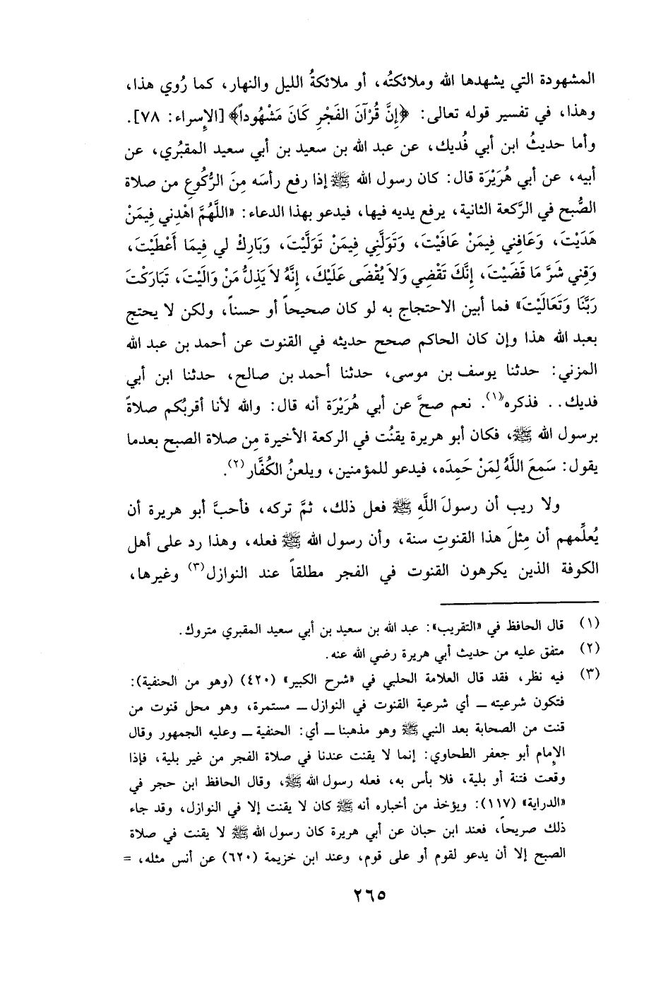 وَأَمَّا حَدِيثُ ابْنِ أَبِي فُدَيْكٍ، عَنْ عبد الله بن سعيد بن أبي سعيد المقبري، عَنْ أَبِيهِ، عَنْ أَبِي هُرَيْرَةَ قَالَ: «كَانَ رَسُولُ اللَّهِ صَلَّى اللَّهُ عَلَيْهِ وَسَلَّمَ إِذَا رَفَعَ رَأْسَهُ مِنَ الرُّكُوعِ مِنْ صَلَاةِ الصُّبْحِ فِي الرَّكْعَةِ الثَّانِيَةِ يَرْفَعُ يَدَيْهِ فِيهَا فَيَدْعُو بِهَذَا الدُّعَاءِ: (اللَّهُمَّ اهْدِنِي فِيمَنْ هَدَيْتَ، وَعَافِنِي فِيمَنْ عَافَيْتَ، وَتَوَلَّنِي فِيمَنْ تَوَلَّيْتَ، وَبَارِكْ لِي فِيمَا أَعْطَيْتَ، وَقِنِي شَرَّ مَا قَضَيْتَ، إِنَّكَ تَقْضِي وَلَا يُقْضَى عَلَيْكَ، إِنَّهُ لَا يَذِلُّ مَنْ وَالَيْتَ، تَبَارَكْتَ رَبَّنَا وَتَعَالَيْتَ» ) فَمَا أَبْيَنَ الِاحْتِجَاجَ بِهِ لَوْ كَانَ صَحِيحًا أَوْ حَسَنًا، وَلَكِنْ لَا يُحْتَجُّ بعبد الله هَذَا، وَإِنْ كَانَ الحاكم صَحَّحَ حَدِيثَهُ فِي الْقُنُوتِ عَنْ أَحْمَدَ بْنِ عَبْدِ اللَّهِ الْمُزَنِيِّ: حَدَّثَنَا يُوسُفُ بْنُ مُوسَى، حَدَّثَنَا أحمد بن صالح، حَدَّثَنَا ابْنُ أَبِي فُدَيْكٍ. . فَذَكَرَهُ.