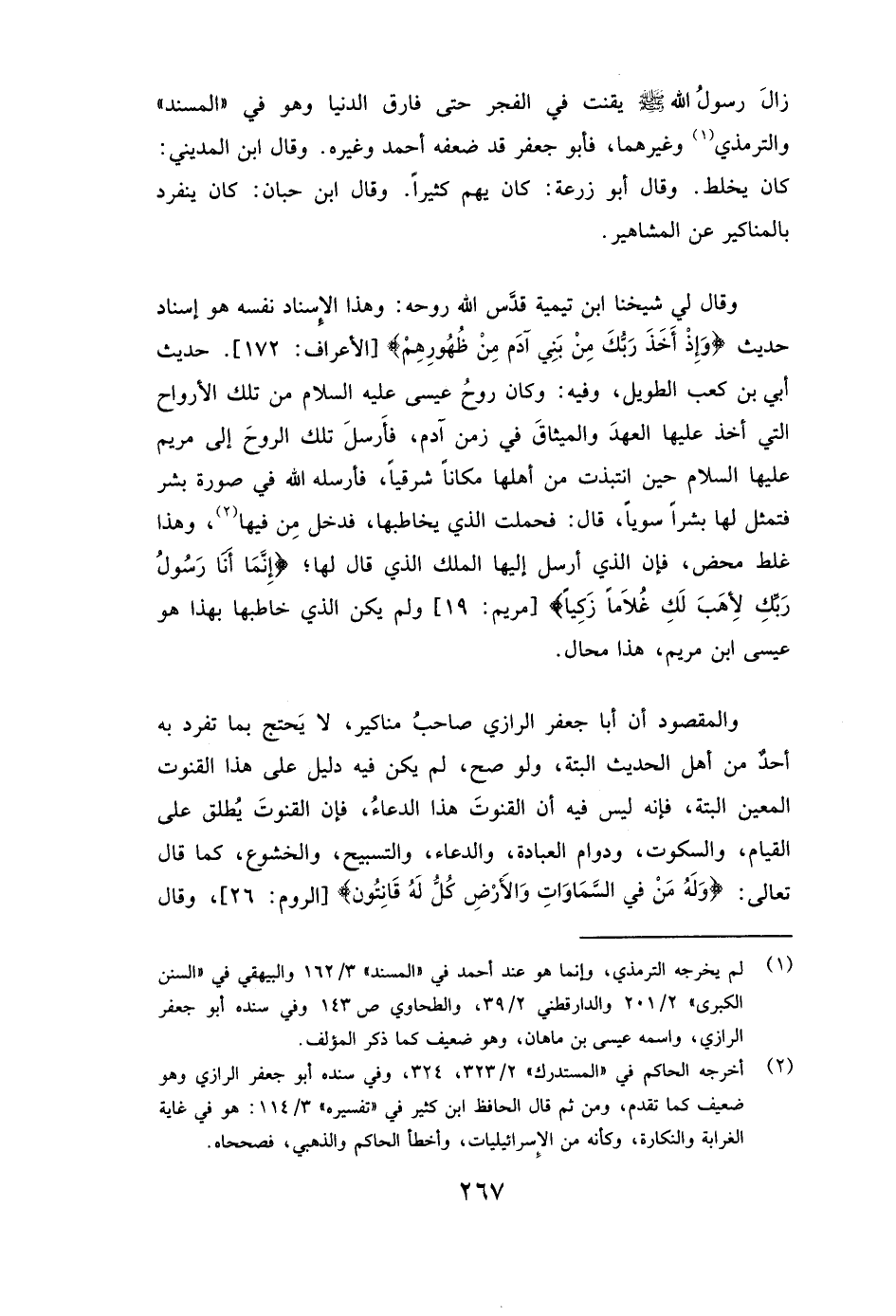 وَالْمَقْصُودُ أَنَّ أبا جعفر الرازي صَاحِبُ مَنَاكِيرَ، لَا يَحْتَجُّ بِمَا تَفَرَّدَ بِهِ أَحَدٌ مِنْ أَهْلِ الْحَدِيثِ الْبَتَّةَ، وَلَوْ صَحَّ لَمْ يَكُنْ فِيهِ دَلِيلٌ عَلَى هَذَا الْقُنُوتِ الْمُعَيَّنِ الْبَتَّةَ، فَإِنَّهُ لَيْسَ فِيهِ أَنَّ الْقُنُوتَ هَذَا الدُّعَاءُ، فَإِنَّ الْقُنُوتَ يُطْلَقُ عَلَى الْقِيَامِ، وَالسُّكُوتِ، وَدَوَامِ الْعِبَادَةِ، وَالدُّعَاءِ، وَالتَّسْبِيحِ، وَالْخُشُوعِ، كَمَا قَالَ تَعَالَى: {وَلَهُ مَنْ فِي السَّمَاوَاتِ وَالْأَرْضِ كُلٌّ لَهُ قَانِتُونَ} [الروم: 26] [الرُّومِ: 26] ، وَقَالَ