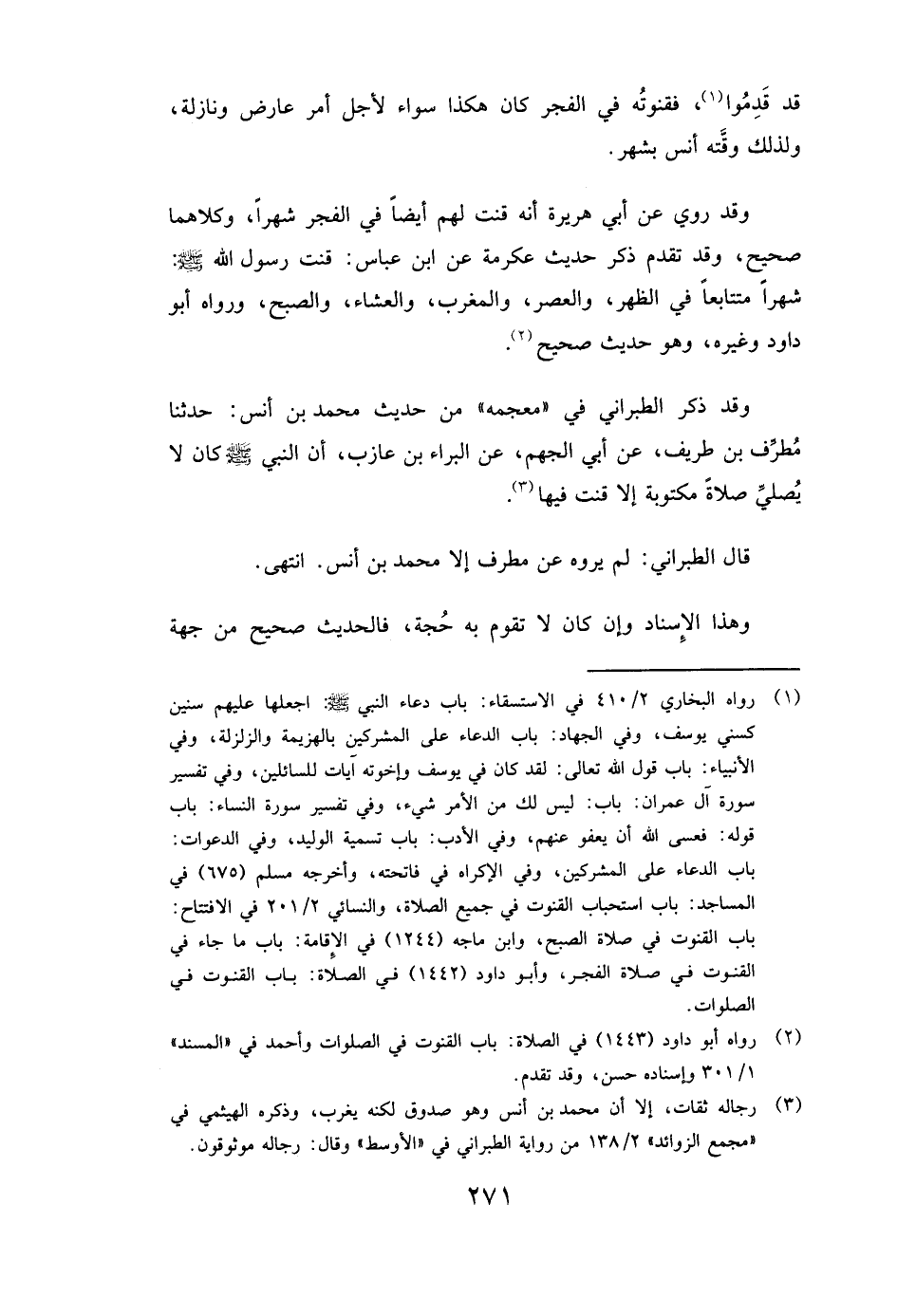 وَقَدْ ذَكَرَ الطَّبَرَانِيُّ فِي " مُعْجَمِهِ " مِنْ حَدِيثِ محمد بن أنس: حَدَّثَنَا مُطَرِّفُ بْنُ طَرِيفٍ، عَنْ أبي الجهم، عَنِ الْبَرَاءِ بْنِ عَازِبٍ، أَنَّ النَّبِيَّ صَلَّى اللَّهُ عَلَيْهِ وَسَلَّمَ ( «كَانَ لَا يُصَلِّي صَلَاةً مَكْتُوبَةً إِلَّا قَنَتَ فِيهَا» ) .