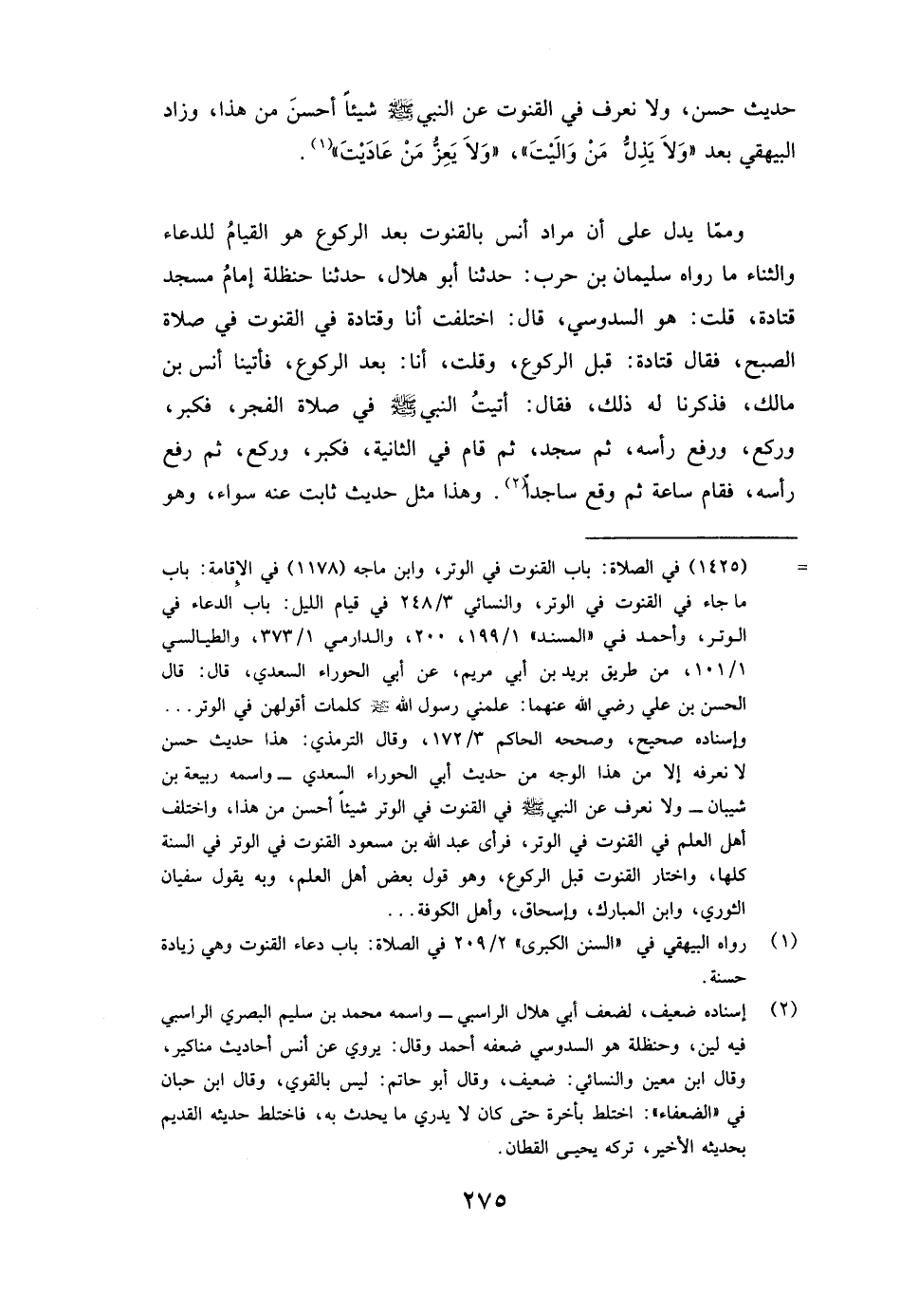 وَمِمَّا يَدُلُّ عَلَى أَنَّ مُرَادَ أنس بِالْقُنُوتِ بَعْدَ الرُّكُوعِ هُوَ الْقِيَامُ لِلدُّعَاءِ وَالثَّنَاءِ، مَا رَوَاهُ سُلَيْمَانُ بْنُ حَرْبٍ: حَدَّثَنَا أبو هلال، حَدَّثَنَا حنظلة إمام مسجد قتادة، قلت: هو السدوسي، قَالَ: «اخْتَلَفْتُ أَنَا وقتادة فِي الْقُنُوتِ فِي صَلَاةِ الصُّبْحِ، فَقَالَ قتادة: قَبْلَ الرُّكُوعِ، وَقُلْتُ أَنَا: بَعْدَ الرُّكُوعِ، فَأَتَيْنَا أَنَسَ بْنَ مَالِكٍ فَذَكَرْنَا لَهُ ذَلِكَ، فَقَالَ: أَتَيْتُ النَّبِيَّ صَلَّى اللَّهُ عَلَيْهِ وَسَلَّمَ فِي صَلَاةِ الْفَجْرِ، فَكَبَّرَ وَرَكَعَ، وَرَفَعَ رَأْسَهُ، ثُمَّ سَجَدَ، ثُمَّ قَامَ فِي الثَّانِيَةِ، فَكَبَّرَ وَرَكَعَ، ثُمَّ رَفَعَ رَأْسَهُ، فَقَامَ سَاعَةً ثُمَّ وَقَعَ سَاجِدًا» .