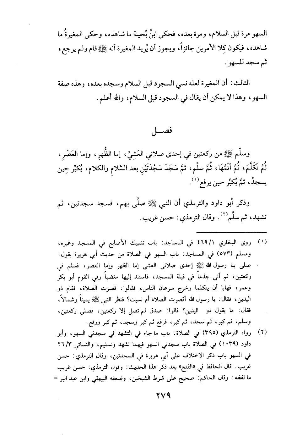 السَّهْوِ مَرَّةً قَبْلَ السَّلَامِ، وَمَرَّةً بَعْدَهُ، فَحَكَى ابن بحينة مَا شَاهَدَهُ، وَحَكَى المغيرة مَا شَاهَدَهُ، فَيَكُونُ كِلَا الْأَمْرَيْنِ جَائِزًا، وَيَجُوزُ أَنْ يُرِيدَ المغيرة أَنَّهُ صَلَّى اللَّهُ عَلَيْهِ وَسَلَّمَ قَامَ وَلَمْ يَرْجِعْ، ثُمَّ سَجَدَ لِلسَّهْوِ.