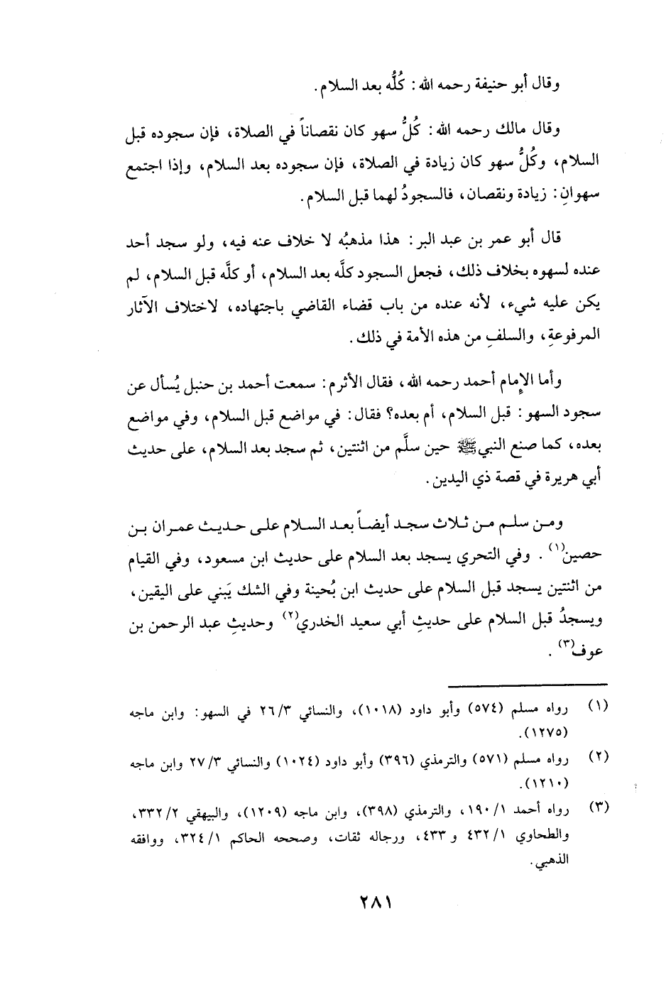 وَأَمَّا الْإِمَامُ أَحْمَدُ رَحِمَهُ اللَّهُ فَقَالَ الأثرم: سَمِعْتُ أَحْمَدَ بْنَ حَنْبَلٍ يُسْأَلُ عَنْ سُجُودِ السَّهْوِ قَبْلَ السَّلَامِ أَمْ بَعْدَهُ؟ فَقَالَ: فِي مَوَاضِعَ قَبْلَ السَّلَامِ، وَفِي مَوَاضِعَ بَعْدَهُ، كَمَا صَنَعَ النَّبِيُّ صَلَّى اللَّهُ عَلَيْهِ وَسَلَّمَ حِينَ سَلَّمَ مِنِ اثْنَتَيْنِ، ثُمَّ سَجَدَ بَعْدَ السَّلَامِ، عَلَى حَدِيثِ أَبِي هُرَيْرَةَ فِي قِصَّةِ ذي اليدين.
