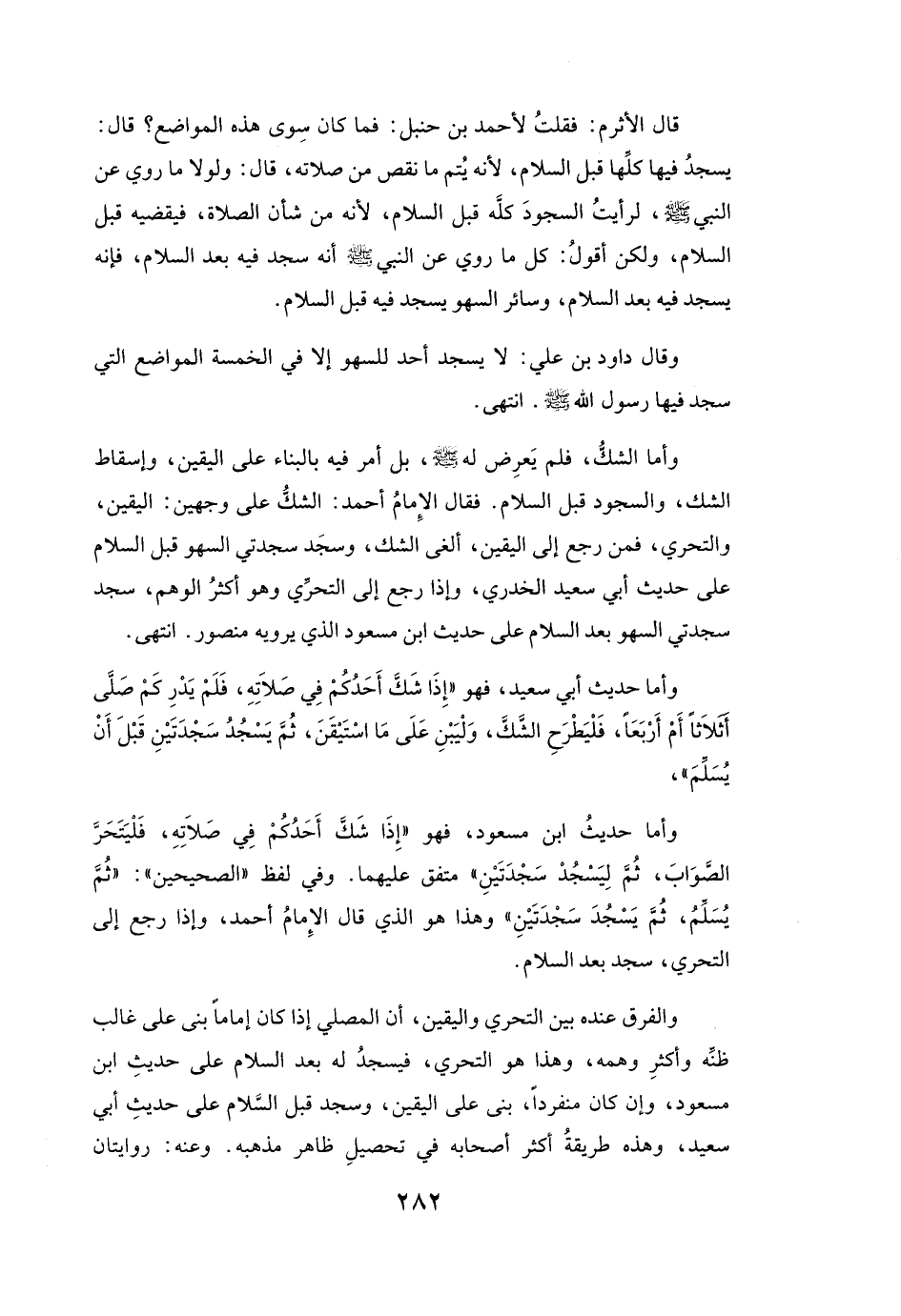 قَالَ الأثرم: فَقُلْتُ لِأَحْمَدَ بْنِ حَنْبَلٍ: فَمَا كَانَ سِوَى هَذِهِ الْمَوَاضِعِ؟ قَالَ يَسْجُدُ فِيهَا كُلِّهَا قَبْلَ السَّلَامِ لِأَنَّهُ يُتِمُّ مَا نَقَصَ مِنْ صَلَاتِهِ، قَالَ: وَلَوْلَا مَا رُوِيَ عَنِ النَّبِيِّ صَلَّى اللَّهُ عَلَيْهِ وَسَلَّمَ لَرَأَيْتُ السُّجُودَ كُلَّهُ قَبْلَ السَّلَامِ؛ لِأَنَّهُ مِنْ شَأْنِ الصَّلَاةِ، فَيَقْضِيهِ قَبْلَ السَّلَامِ وَلَكِنْ أَقُولُ: كُلُّ مَا رُوِيَ عَنِ النَّبِيِّ صَلَّى اللَّهُ عَلَيْهِ وَسَلَّمَ أَنَّهُ سَجَدَ فِيهِ بَعْدَ السَّلَامِ، فَإِنَّهُ يَسْجُدُ فِيهِ بَعْدَ السَّلَامِ، وَسَائِرُ السَّهْوِ يَسْجُدُ فِيهِ قَبْلَ السَّلَامِ.