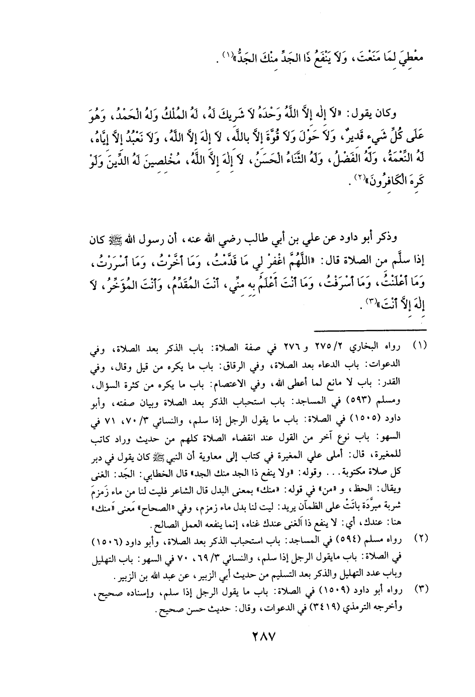 وَذَكَرَ أبو داود عَنْ عَلِيِّ بْنِ أَبِي طَالِبٍ رَضِيَ اللَّهُ عَنْهُ، «أَنَّ رَسُولَ اللَّهِ صَلَّى اللَّهُ عَلَيْهِ وَسَلَّمَ كَانَ إِذَا سَلَّمَ مِنَ الصَّلَاةِ قَالَ: (اللَّهُمَّ اغْفِرْ لِي مَا قَدَّمْتُ، وَمَا أَخَّرْتُ وَمَا أَسَرَرْتُ وَمَا أَعْلَنْتُ، وَمَا أَسْرَفْتُ، وَمَا أَنْتَ أَعْلَمُ بِهِ مِنِّي، أَنْتَ الْمُقَدِّمُ، وَأَنْتَ الْمُؤَخِّرُ، لَا إِلَهَ إِلَّا أَنْتَ» )