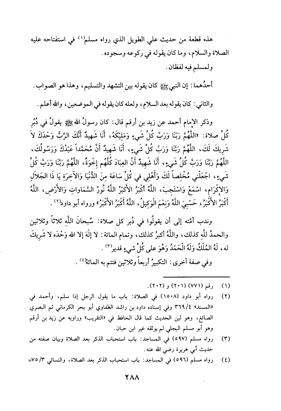 وَذَكَرَ الْإِمَامُ أَحْمَدُ عَنْ زَيْدِ بْنِ أَرْقَمَ قَالَ: كَانَ رَسُولُ اللَّهِ صَلَّى اللَّهُ عَلَيْهِ وَسَلَّمَ يَقُولُ فِي دُبُرِ كُلِّ صَلَاةٍ: ( «اللَّهُمَّ رَبَّنَا وَرَبَّ كُلِّ شَيْءٍ وَمَلِيكَهُ، أَنَا شَهِيدٌ أَنَّكَ الرَّبُّ وَحْدَكَ لَا شَرِيكَ لَكَ، اللَّهُمَّ رَبَّنَا وَرَبَّ كُلِّ شَيْءٍ، أَنَا شَهِيدٌ أَنَّ مُحَمَّدًا عَبْدُكَ وَرَسُولُكَ، اللَّهُمَّ رَبَّنَا وَرَبَّ كُلِّ شَيْءٍ، أَنَا شَهِيدٌ أَنَّ الْعِبَادَ كُلَّهُمْ إِخْوَةٌ، اللَّهُمَّ رَبَّنَا وَرَبَّ كُلِّ شَيْءٍ، اجْعَلْنِي مُخْلِصًا لَكَ وَأَهْلِي فِي كُلِّ سَاعَةٍ مِنَ الدُّنْيَا وَالْآخِرَةِ يَا ذَا الْجَلَالِ وَالْإِكْرَامِ، اسْمَعْ وَاسْتَجِبِ، اللَّهُ أَكْبَرُ الْأَكْبَرُ، اللَّهُ نُورُ السَّمَاوَاتِ وَالْأَرْضِ، اللَّهُ أَكْبَرُ الْأَكْبَرُ، حَسْبِيَ اللَّهُ وَنِعْمَ الْوَكِيلُ، اللَّهُ أَكْبَرُ الْأَكْبَرُ» ) رَوَاهُ أبو داود.