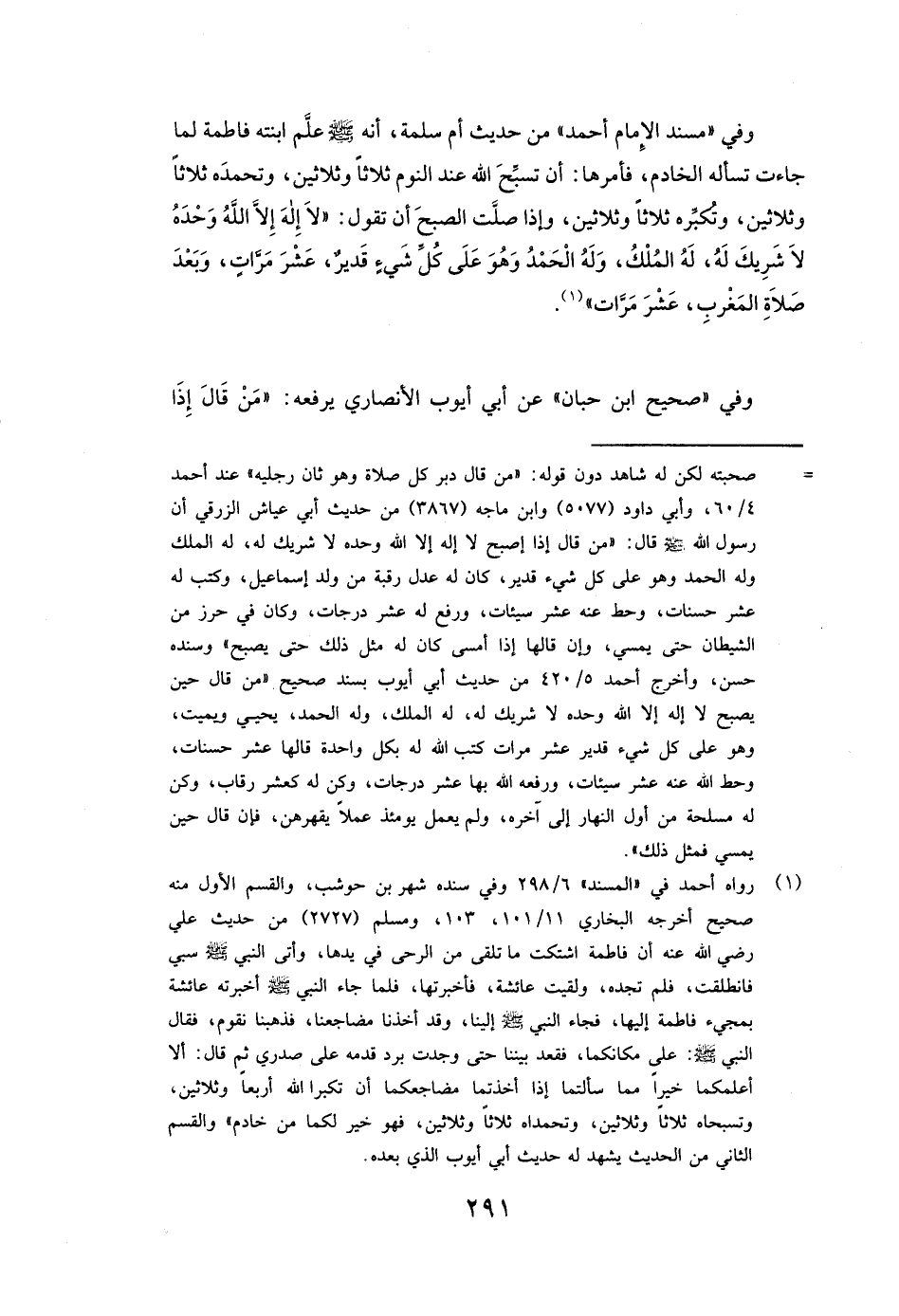 وَفِي "مُسْنَدِ الْإِمَامِ أَحْمَدَ " مِنْ حَدِيثِ أم سلمة، أَنَّهُ صَلَّى اللَّهُ عَلَيْهِ وَسَلَّمَ، ( «عَلَّمَ ابْنَتَهُ فاطمة لَمَّا جَاءَتْ تَسْأَلُهُ الْخَادِمَ، فَأَمَرَهَا: أَنْ تُسَبِّحَ اللَّهَ عِنْدَ النَّوْمِ ثَلَاثًا وَثَلَاثِينَ، وَتَحْمَدَهُ ثَلَاثًا وَثَلَاثِينَ، وَتُكَبِّرَهُ ثَلَاثًا وَثَلَاثِينَ، وَإِذَا صَلَّتِ الصُّبْحَ أَنْ تَقُولَ: "لَا إِلَهَ إِلَّا اللَّهُ وَحْدَهُ لَا شَرِيكَ لَهُ، لَهُ الْمُلْكُ، وَلَهُ الْحَمْدُ وَهُوَ عَلَى كُلِّ شَيْءٍ قَدِيرٌ، عَشْرَ مَرَّاتٍ، وَبَعْدَ صَلَاةِ الْمَغْرِبِ، عَشْرَ مَرَّاتٍ» ) .