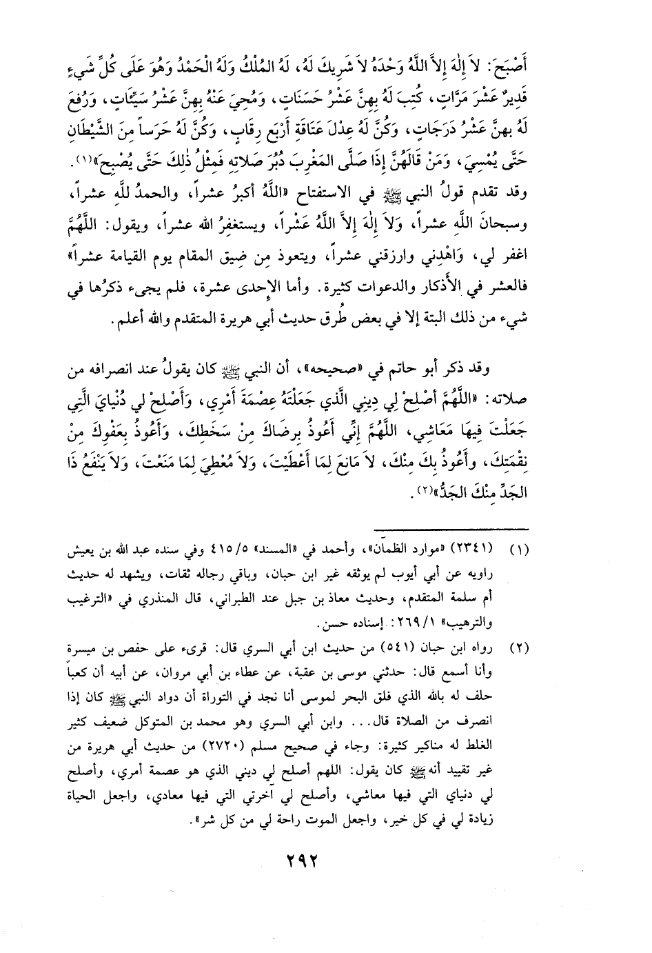 وَقَدْ ذَكَرَ أبو حاتم فِي "صَحِيحِهِ" أَنَّ النَّبِيَّ صَلَّى اللَّهُ عَلَيْهِ وَسَلَّمَ كَانَ يَقُولُ عِنْدَ انْصِرَافِهِ مِنْ صَلَاتِهِ: ( «اللَّهُمَّ أَصْلِحْ لِي دِينِي الَّذِي جَعَلْتَهُ عِصْمَةَ أَمْرِي، وَأَصْلِحْ لِي دُنْيَايَ الَّتِي جَعَلْتَ فِيهَا مَعَاشِي، اللَّهُمَّ إِنِّي أَعُوذُ بِرِضَاكَ مِنْ سَخَطِكَ، وَأَعُوذُ بِعَفْوِكَ مِنْ نِقْمَتِكَ، وَأَعُوذُ بِكَ مِنْكَ، لَا مَانِعَ لِمَا أَعْطَيْتَ، وَلَا مُعْطِيَ لِمَا مَنَعْتَ، وَلَا يَنْفَعُ ذَا الْجَدِّ مِنْكَ الْجَدُّ» )