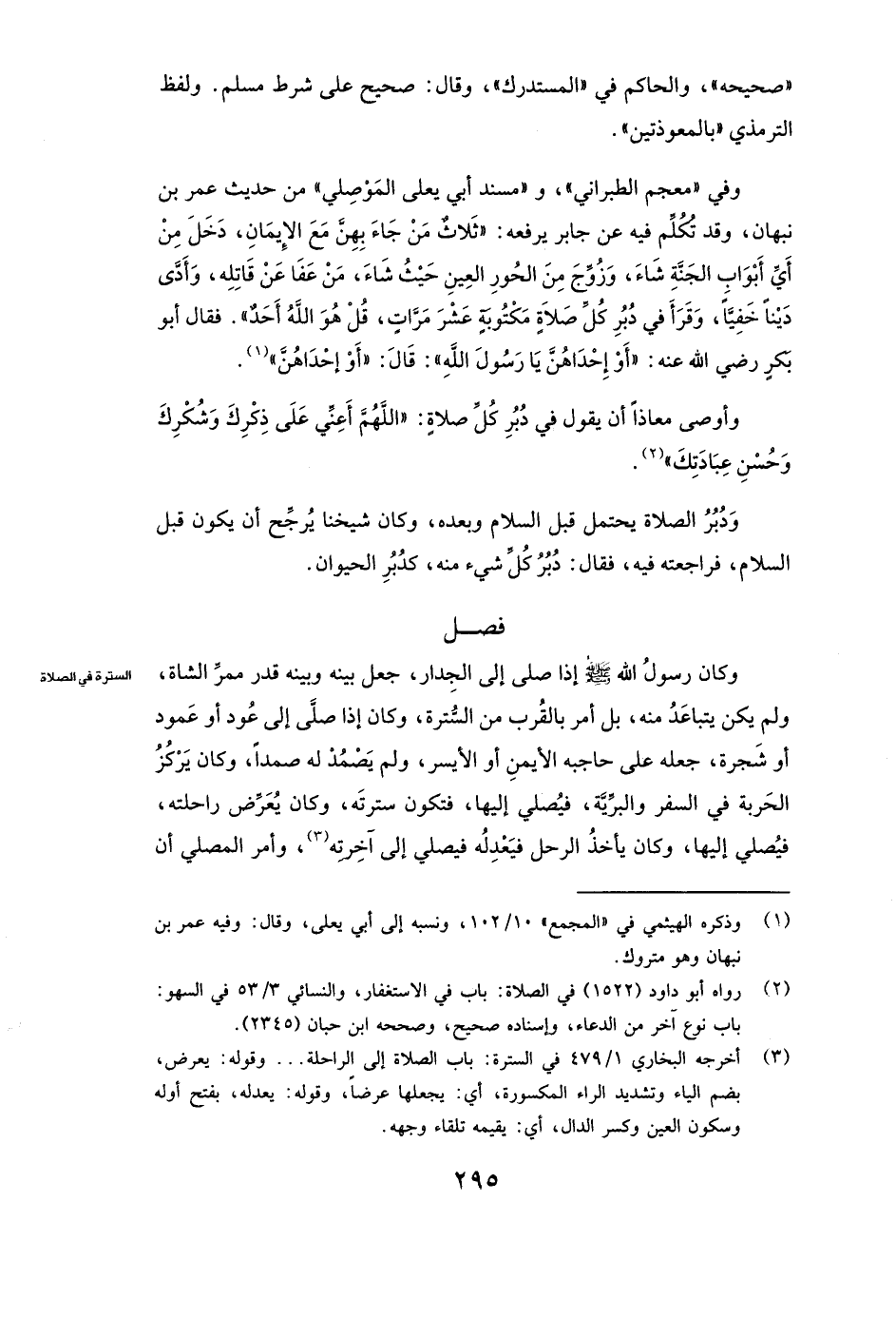 وَكَانَ رَسُولُ اللَّهِ صَلَّى اللَّهُ عَلَيْهِ وَسَلَّمَ إِذَا صَلَّى إِلَى الْجِدَارِ، جَعَلَ بَيْنَهُ وَبَيْنَهُ قَدْرَ مَمَرِّ الشَّاةِ، وَلَمْ يَكُنْ يَتَبَاعَدُ مِنْهُ، بَلْ أَمَرَ بِالْقُرْبِ مِنَ السُّتْرَةِ، وَكَانَ إِذَا صَلَّى إِلَى عُودٍ أَوْ عَمُودٍ أَوْ شَجَرَةٍ، جَعَلَهُ عَلَى حَاجِبِهِ الْأَيْمَنِ أَوِ الْأَيْسَرِ، وَلَمْ يَصْمُدْ لَهُ صَمْدًا، وَكَانَ يَرْكُزُ الْحَرْبَةَ فِي السَّفَرِ وَالْبَرِّيَّةِ، فَيُصَلِّي إِلَيْهَا، فَتَكُونُ سُتْرَتَهُ، وَكَانَ يُعَرِّضُ رَاحِلَتَهُ، فَيُصَلِّي إِلَيْهَا، وَكَانَ يَأْخُذُ الرَّحْلَ فَيَعْدِلُهُ فَيُصَلِّي إِلَى آخِرَتِهِ، ( «وَأَمَرَ الْمُصَلِّيَ أَنْ
