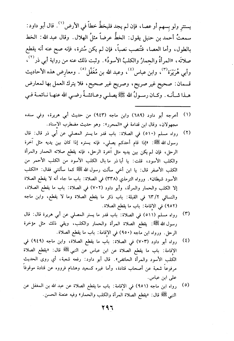 قَالَ أبو داود: سَمِعْتُ أَحْمَدَ بْنَ حَنْبَلٍ يَقُولُ: الْخَطُّ عَرْضًا مِثْلُ الْهِلَالِ. وَقَالَ عبد الله: الْخَطُّ بِالطُّولِ، وَأَمَّا الْعَصَا، فَتُنْصَبُ نَصْبًا، فَإِنْ لَمْ يَكُنْ سُتْرَةٌ، فَإِنَّهُ صَحَّ عَنْهُ أَنَّهُ يَقْطَعُ صَلَاتَهُ، "الْمَرْأَةُ وَالْحِمَارُ وَالْكَلْبُ الْأَسْوَدُ ".