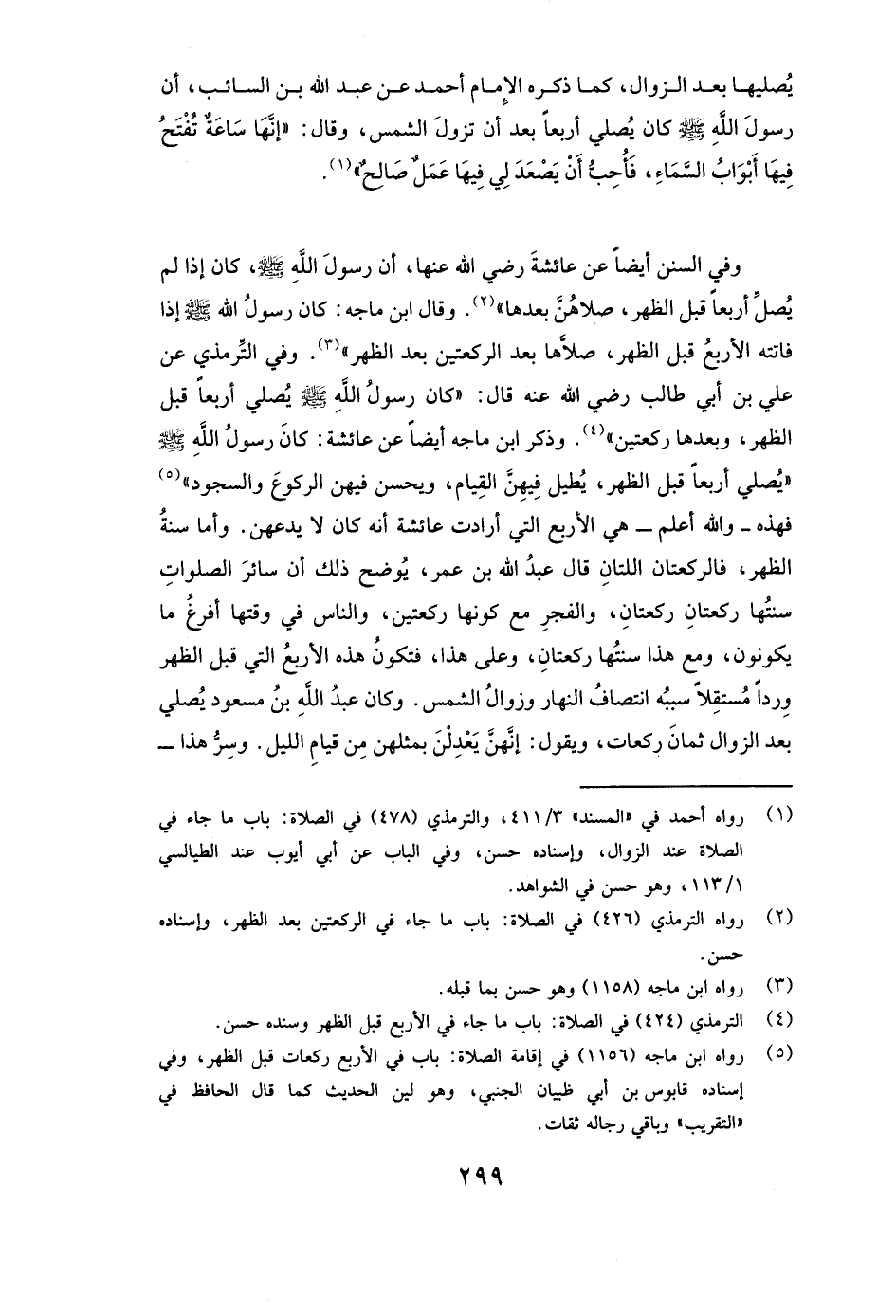 وَذَكَرَ ابْنُ مَاجَهْ أَيْضًا عَنْ عائشة: ( «كَانَ رَسُولُ اللَّهِ صَلَّى اللَّهُ عَلَيْهِ وَسَلَّمَ " يُصَلِّي أَرْبَعًا قَبْلَ الظُّهْرِ، يُطِيلُ فِيهِنَّ الْقِيَامَ، وَيُحْسِنُ فِيهِنَّ الرُّكُوعَ وَالسُّجُودَ» ) فَهَذِهِ - وَاللَّهُ أَعْلَمُ - هِيَ الْأَرْبَعُ الَّتِي أَرَادَتْ عائشة أَنَّهُ كَانَ لَا يَدَعُهُنَّ.