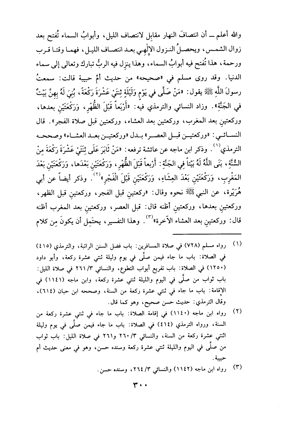 وَاللَّهُ أَعْلَمُ- أَنَّ انْتِصَافَ النَّهَارِ مُقَابِلٌ لِانْتِصَافِ اللَّيْلِ، وَأَبْوَابُ السَّمَاءِ تُفَتَّحُ بَعْدَ زَوَالِ الشَّمْسِ، وَيَحْصُلُ النُّزُولُ الْإِلَهِيُّ بَعْدَ انْتِصَافِ اللَّيْلِ، فَهُمَا وَقْتَا قُرْبٍ وَرَحْمَةٍ، هَذَا تُفْتَحُ فِيهِ أَبْوَابُ السَّمَاءِ، وَهَذَا يَنْزِلُ فِيهِ الرَّبُّ تَبَارَكَ وَتَعَالَى إِلَى سَمَاءِ الدُّنْيَا. وَقَدْ رَوَى مسلم فِي "صَحِيحِهِ" مِنْ حَدِيثِ أم حبيبة قَالَتْ: سَمِعْتُ رَسُولَ اللَّهِ صَلَّى اللَّهُ عَلَيْهِ وَسَلَّمَ يَقُولُ: ( «مَنْ صَلَّى فِي يَوْمٍ وَلَيْلَةٍ ثِنْتَيْ عَشْرَةَ رَكْعَةً، بُنِيَ لَهُ بِهِنَّ بَيْتٌ فِي الْجَنَّةِ» ) . وَزَادَ النَّسَائِيُّ وَالتِّرْمِذِيُّ فِيهِ: ( «أَرْبَعًا قَبْلَ الظُّهْرِ، وَرَكْعَتَيْنِ بَعْدَهَا، وَرَكْعَتَيْنِ بَعْدَ الْمَغْرِبِ، وَرَكْعَتَيْنِ بَعْدَ الْعِشَاءِ، وَرَكْعَتَيْنِ قَبْلَ صَلَاةِ الْفَجْرِ» ) . قَالَ النَّسَائِيُّ: ( «وَرَكْعَتَيْنِ قَبْلَ الْعَصْرِ» ) بَدَلَ ( «وَرَكْعَتَيْنِ بَعْدَ الْعِشَاءِ» ) وَصَحَّحَهُ الترمذي.