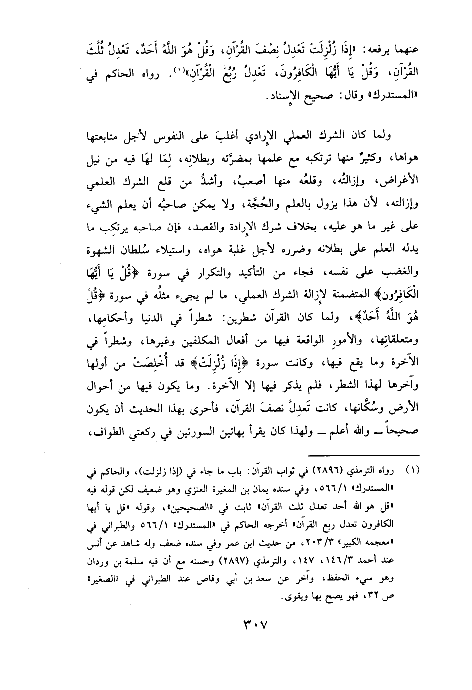 وَلَمَّا كَانَ الشِّرْكُ الْعَمَلِيُّ الْإِرَادِيُّ أَغْلَبَ عَلَى النُّفُوسِ لِأَجْلِ مُتَابَعَتِهَا هَوَاهَا، وَكَثِيرٌ مِنْهَا تَرْتَكِبُهُ مَعَ عِلْمِهَا بِمَضَرَّتِهِ وَبُطْلَانِهِ، لِمَا لَهَا فِيهِ مِنْ نَيْلِ الْأَغْرَاضِ، وَإِزَالَتُهُ وَقَلْعُهُ مِنْهَا أَصْعَبُ، وَأَشَدُّ مِنْ قَلْعِ الشِّرْكِ الْعِلْمِيِّ وَإِزَالَتِهِ، لِأَنَّ هَذَا يَزُولُ بِالْعِلْمِ وَالْحُجَّةِ، وَلَا يُمْكِنُ صَاحِبُهُ أَنْ يَعْلَمَ الشَّيْءَ عَلَى غَيْرِ مَا هُوَ عَلَيْهِ، بِخِلَافِ شِرْكِ الْإِرَادَةِ وَالْقَصْدِ، فَإِنَّ صَاحِبَهُ يَرْتَكِبُ مَا يَدُلُّهُ الْعِلْمُ عَلَى بُطْلَانِهِ وَضَرَرِهِ لِأَجْلِ غَلَبَةِ هَوَاهُ، وَاسْتِيلَاءِ سُلْطَانِ الشَّهْوَةِ وَالْغَضَبِ عَلَى نَفْسِهِ، فَجَاءَ مِنَ التَّأْكِيدِ وَالتَّكْرَارِ فِي سُورَةِ {قُلْ يَاأَيُّهَا الْكَافِرُونَ} [الكافرون: 1] الْمُتَضَمِّنَةِ لِإِزَالَةِ الشِّرْكِ الْعَمَلِيِّ، مَا لَمْ يَجِئْ مِثْلُهُ فِي سُورَةِ {قُلْ هُوَ اللَّهُ أَحَدٌ} [الإخلاص: 1] ، وَلَمَّا كَانَ الْقُرْآنُ شَطْرَيْنِ: شَطْرًا فِي الدُّنْيَا وَأَحْكَامِهَا، وَمُتَعَلَّقَاتِهَا، وَالْأُمُورِ الْوَاقِعَةِ فِيهَا مِنْ أَفْعَالِ الْمُكَلَّفِينَ وَغَيْرِهَا، وَشَطْرًا فِي الْآخِرَةِ وَمَا يَقَعُ فِيهَا، وَكَانَتْ سُورَةُ {إِذَا زُلْزِلَتِ} [الزلزلة: 1] قَدْ أُخْلِصَتْ مِنْ أَوَّلِهَا وَآخِرِهَا لِهَذَا الشَّطْرِ، فَلَمْ يُذْكُرْ فِيهَا إِلَّا الْآخِرَةُ وَمَا يَكُونُ فِيهَا مِنْ أَحْوَالِ الْأَرْضِ وَسُكَّانِهَا، كَانَتْ تَعْدِلُ نِصْفَ الْقُرْآنِ، فَأَحْرَى بِهَذَا الْحَدِيثِ أَنْ يَكُونَ صَحِيحًا - وَاللَّهُ أَعْلَمُ - وَلِهَذَا كَانَ يَقْرَأُ بِهَاتَيْنِ السُّورَتَيْنِ فِي رَكْعَتَيِ الطَّوَافِ