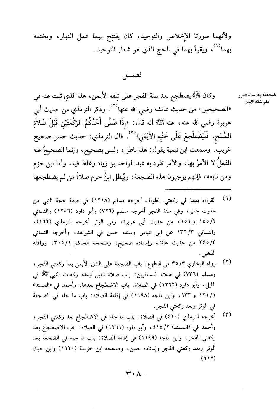 وَكَانَ صَلَّى اللَّهُ عَلَيْهِ وَسَلَّمَ يَضْطَجِعُ بَعْدَ سُنَّةِ الْفَجْرِ عَلَى شِقِّهِ الْأَيْمَنِ، هَذَا الَّذِي ثَبَتَ عَنْهُ فِي "الصَّحِيحَيْنِ" مِنْ حَدِيثِ عائشة رَضِيَ اللَّهُ عَنْهَا. وَذَكَرَ الترمذي مِنْ حَدِيثِ أَبِي هُرَيْرَةَ رَضِيَ اللَّهُ عَنْهُ، عَنْهُ صَلَّى اللَّهُ عَلَيْهِ وَسَلَّمَ أَنَّهُ قَالَ: " «إِذَا صَلَّى أَحَدُكُمُ الرَّكْعَتَيْنِ قَبْلَ صَلَاةِ الصُّبْحِ، فَلْيَضْطَجِعْ عَلَى جَنْبِهِ الْأَيْمَنِ» ". قَالَ الترمذي: حَدِيثٌ حَسَنٌ صَحِيحٌ غَرِيبٌ.