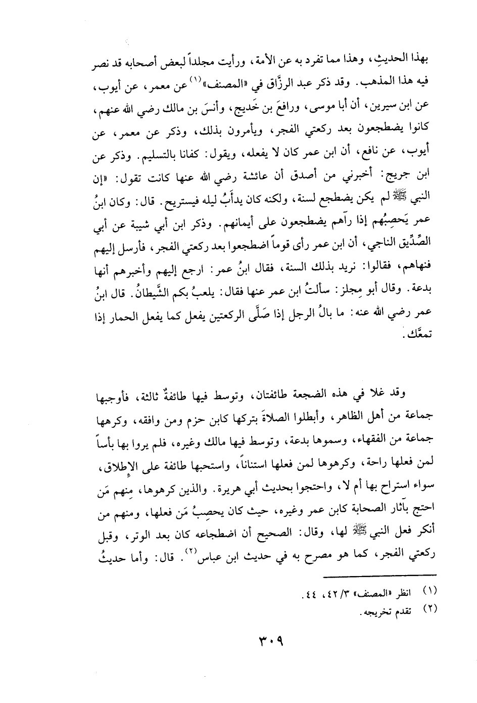 وَقَدْ ذَكَرَ عبد الرزاق فِي "الْمُصَنَّفِ" عَنْ معمر، عَنْ أيوب، عَنِ ابْنِ سِيرِينَ، أَنَّ أبا موسى وَرَافِعَ بْنَ خَدِيجٍ، وَأَنَسَ بْنِ مَالِكٍ رَضِيَ اللَّهُ عَنْهُمْ، (كَانُوا يَضْطَجِعُونَ بَعْدَ رَكْعَتَيِ الْفَجْرِ، وَيَأْمُرُونَ بِذَلِكَ) وَذُكِرَ عَنْ معمر، عَنْ أيوب، عَنْ نافع، أَنَّ ابْنَ عُمَرَ كَانَ لَا يَفْعَلُهُ، وَيَقُولُ: كَفَانَا بِالتَّسْلِيمِ.