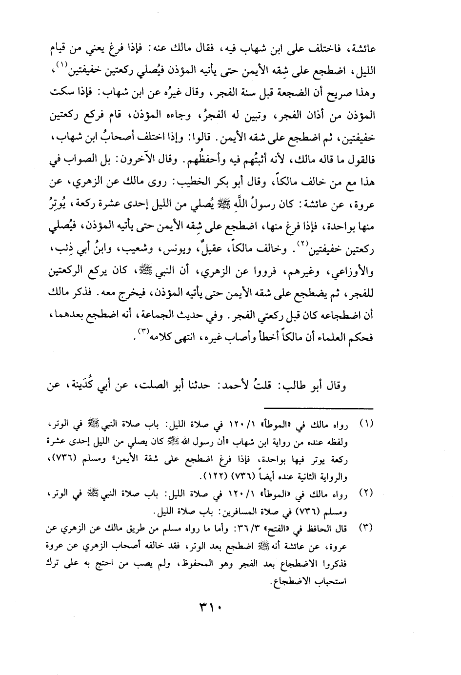 قَالُوا: وَإِذَا اخْتَلَفَ أَصْحَابُ ابْنِ شِهَابٍ، فَالْقَوْلُ مَا قَالَهُ مالك، لِأَنَّهُ أَثْبَتُهُمْ فِيهِ وَأَحْفَظُهُمْ. وَقَالَ الْآخَرُونَ: بَلِ الصَّوَابُ فِي هَذَا مَعَ مَنْ خَالَفَ مالكا، وَقَالَ أَبُو بَكْرٍ الْخَطِيبُ: رَوَى مالك عَنِ الزُّهْرِيِّ، عَنْ عروة، عَنْ عائشة: ( «كَانَ رَسُولُ اللَّهِ صَلَّى اللَّهُ عَلَيْهِ وَسَلَّمَ يُصَلِّي مِنَ اللَّيْلِ إِحْدَى عَشْرَةَ رَكْعَةً، يُوتِرُ مِنْهَا بِوَاحِدَةٍ، فَإِذَا فَرَغَ مِنْهَا اضْطَجَعَ عَلَى شِقِّهِ الْأَيْمَنِ حَتَّى يَأْتِيَهُ الْمُؤَذِّنُ، فَيُصَلِّي رَكْعَتَيْنِ خَفِيفَتَيْنِ» )