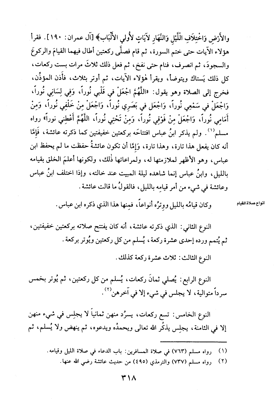 وَكَانَ قِيَامُهُ بِاللَّيْلِ وَوِتْرُهُ أَنْوَاعًا، فَمِنْهَا هَذَا الَّذِي ذَكَرَهُ ابْنُ عَبَّاسٍ.