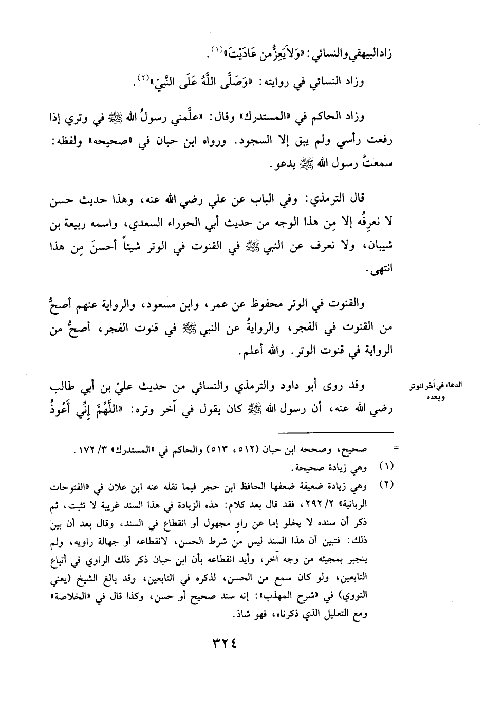 وَقَدْ رَوَى أبو داود وَالتِّرْمِذِيُّ وَالنَّسَائِيُّ مِنْ حَدِيثِ عَلِيِّ بْنِ أَبِي طَالِبٍ رَضِيَ اللَّهُ عَنْهُ، أَنَّ رَسُولَ اللَّهِ صَلَّى اللَّهُ عَلَيْهِ وَسَلَّمَ كَانَ يَقُولُ فِي آخِرِ وِتْرِهِ: ( «اللَّهُمَّ إِنِّي أَعُوذُ
