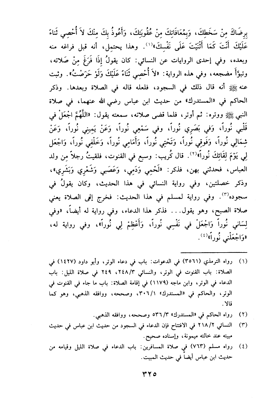 وَذَكَرَ الحاكم فِي "الْمُسْتَدْرَكِ" مِنْ «حَدِيثِ ابْنِ عَبَّاسٍ رَضِيَ اللَّهُ عَنْهُمَا، فِي صَلَاةِ النَّبِيِّ صَلَّى اللَّهُ عَلَيْهِ وَسَلَّمَ وَوِتْرِهِ: ثُمَّ أَوْتَرَ، فَلَمَّا قَضَى صَلَاتَهُ، سَمِعْتُهُ يَقُولُ: (اللَّهُمَّ اجْعَلْ فِي قَلْبِي نُورًا، وَفِي بَصَرِي نُورًا، وَفِي سَمْعِي نُورًا، وَعَنْ يَمِينِي نُورًا، وَعَنْ شِمَالِي نُورًا، وَفَوْقِي نُورًا، وَتَحْتِي نُورًا، وَأَمَامِي نُورًا، وَخَلْفِي نُورًا، وَاجْعَلْ لِي يَوْمَ لِقَائِكَ نُورًا) »