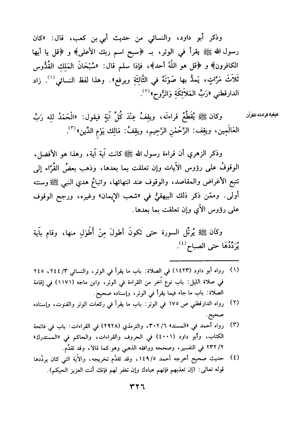 وَكَانَ صَلَّى اللَّهُ عَلَيْهِ وَسَلَّمَ يُرَتِّلُ السُّورَةَ حَتَّى تَكُونَ أَطْوَلَ مِنْ أَطْوَلَ مِنْهَا، وَقَامَ بِآيَةٍ يُرَدِّدُهَا حَتَّى الصَّبَاحِ