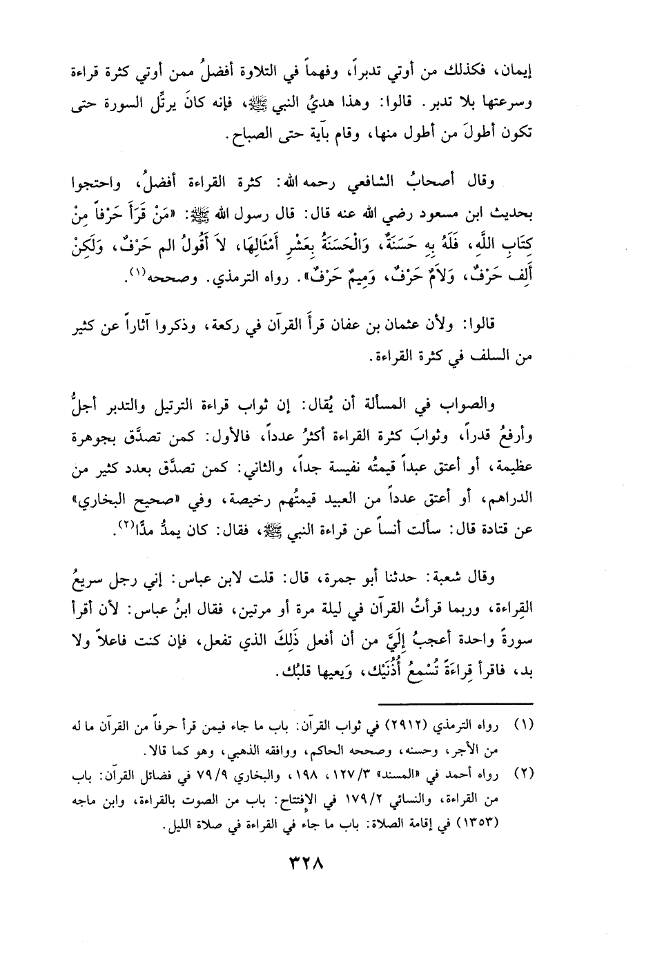 وَقَالَ أَصْحَابُ الشَّافِعِيِّ رَحِمَهُ اللَّهُ: كَثْرَةُ الْقِرَاءَةِ أَفَضْلُ، وَاحْتَجُّوا بِحَدِيثِ ابْنِ مَسْعُودٍ رَضِيَ اللَّهُ عَنْهُ قَالَ: قَالَ رَسُولُ اللَّهِ صَلَّى اللَّهُ عَلَيْهِ وَسَلَّمَ: ( «مَنْ قَرَأَ حَرْفًا مِنْ كِتَابِ اللَّهِ، فَلَهُ بِهِ حَسَنَةٌ، وَالْحَسَنَةُ بِعَشْرِ أَمْثَالِهَا، لَا أَقُولُ: الم حَرْفٌ، وَلَكِنْ أَلِفٌ حَرْفٌ، وَلَامٌ حَرْفٌ، وَمِيمٌ حَرْفٌ» ) . رَوَاهُ الترمذي وَصَحَّحَهُ.