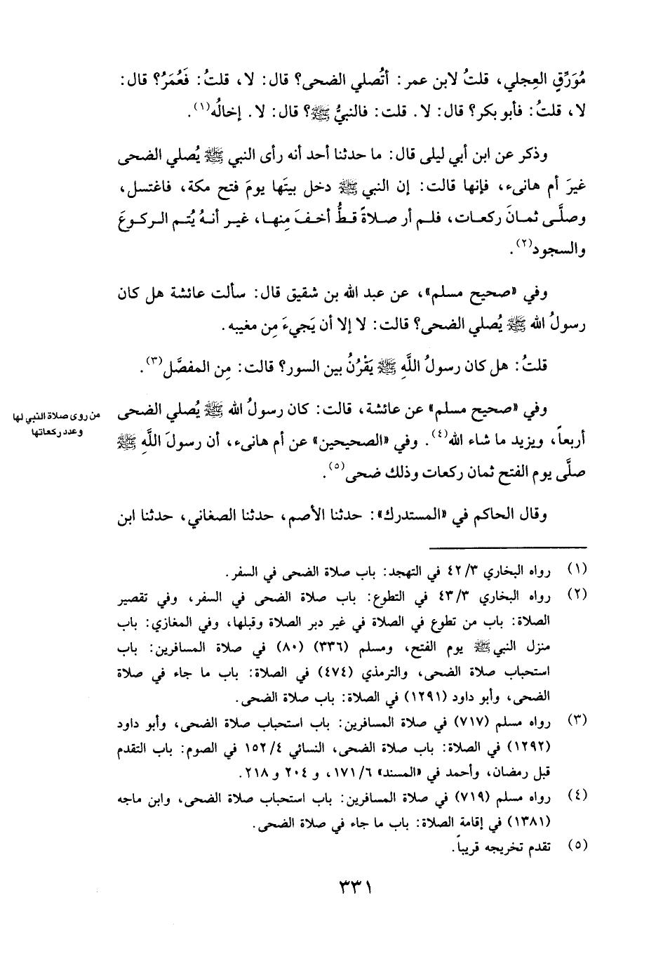 مُوَرِّقٍ الْعِجْلِيِّ: ( «قُلْتُ لِابْنِ عُمَرَ: أَتُصَلِّي الضُّحَى؟ قَالَ: لَا، قُلْتُ: فعمر؟ قَالَ: لَا، قُلْتُ: فأبو بكر؟ قَالَ: لَا. قُلْتُ: فَالنَّبِيُّ صَلَّى اللَّهُ عَلَيْهِ وَسَلَّمَ؟ قَالَ: لَا. إِخَالُهُ» )