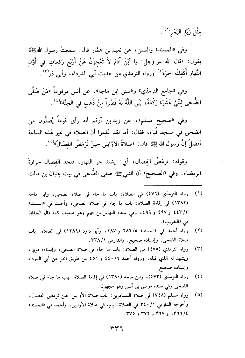 وَفِي "صَحِيحِ مسلم "، «عَنْ زَيْدِ بْنِ أَرْقَمَ أَنَّهُ رَأَى قَوْمًا يُصَلُّونَ مِنَ الضُّحَى فِي مَسْجِدِ قُبَاءٍ، فَقَالَ: أَمَا لَقَدْ عَلِمُوا أَنَّ الصَّلَاةَ فِي غَيْرِ هَذِهِ السَّاعَةِ أَفْضَلُ إِنَّ رَسُولَ اللَّهِ صَلَّى اللَّهُ عَلَيْهِ وَسَلَّمَ قَالَ: (صَلَاةُ الْأَوَّابِينَ حِينَ تَرْمَضُ الْفِصَالُ) » .