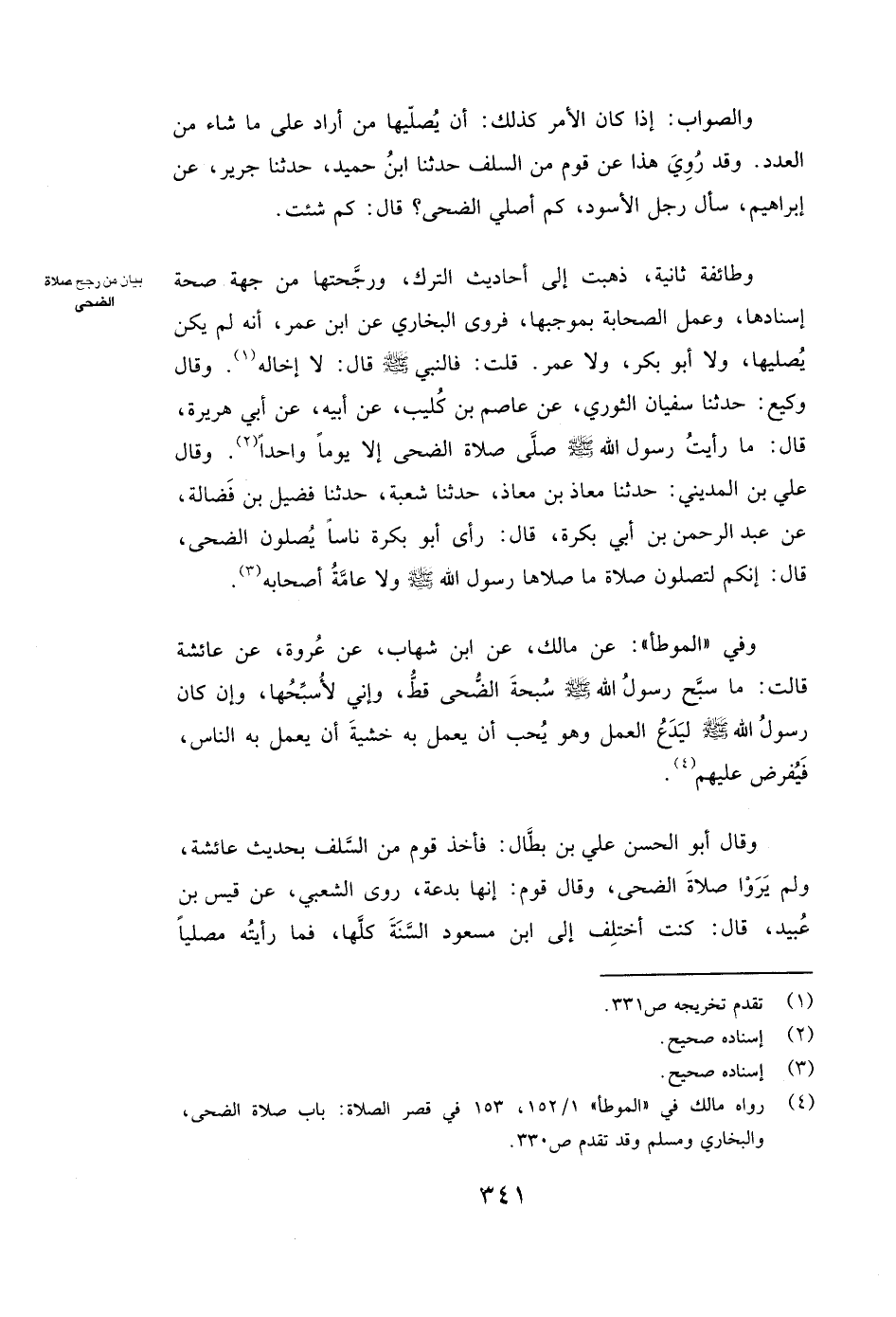 وَطَائِفَةٌ ثَانِيَةٌ، ذَهَبَتْ إِلَى أَحَادِيثِ التَّرْكِ، وَرَجَّحَتْهَا مِنْ جِهَةِ صِحَّةِ إِسْنَادِهَا، وَعَمَلِ الصَّحَابَةِ بِمُوجِبِهَا، فَرَوَى الْبُخَارِيُّ «عَنِ ابْنِ عُمَرَ، أَنَّهُ لَمْ يَكُنْ يُصَلِّيهَا، وَلَا أبو بكر، وَلَا عمر. قُلْتُ: فَالنَّبِيُّ صَلَّى اللَّهُ عَلَيْهِ وَسَلَّمَ؛ قَالَ: لَا إِخَالُهُ» . وَقَالَ وَكِيعٌ: حَدَّثَنَا سُفْيَانُ الثَّوْرِيُّ، عَنْ عاصم بن كليب، عَنْ أَبِيهِ، «عَنْ أَبِي هُرَيْرَةَ، قَالَ: (مَا رَأَيْتُ رَسُولَ اللَّهِ صَلَّى اللَّهُ عَلَيْهِ وَسَلَّمَ صَلَّى صَلَاةَ الضُّحَى إِلَّا يَوْمًا وَاحِدًا) » .