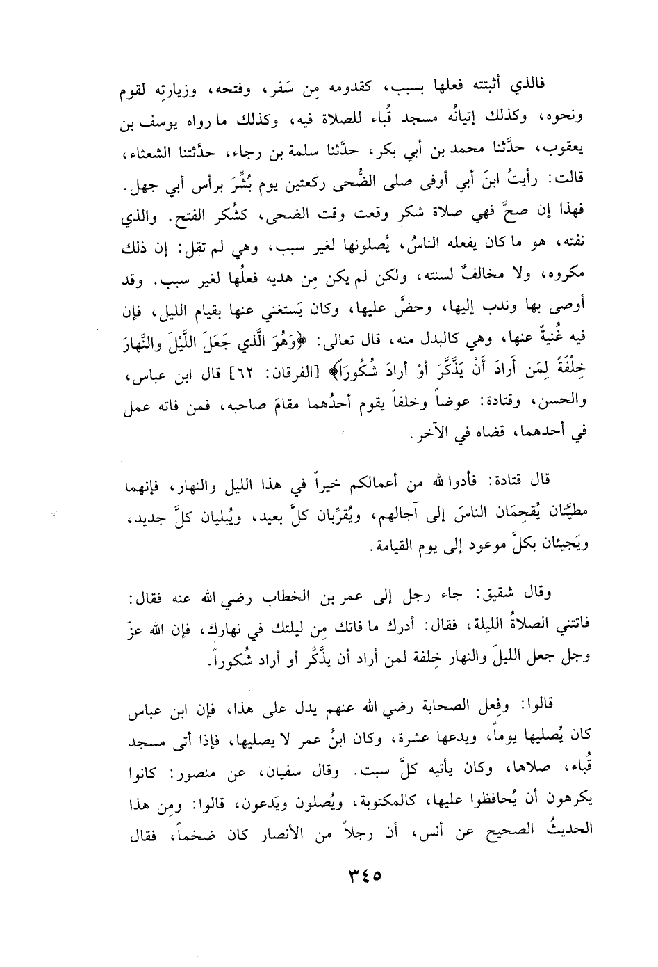 فَالَّذِي أَثْبَتَتْهُ فِعْلُهَا بِسَبَبٍ، كَقُدُومِهِ مِنْ سَفَرٍ، وَفَتْحِهِ، وَزِيَارَتِهِ لِقَوْمٍ وَنَحْوِهِ، وَكَذَلِكَ إِتْيَانُهُ مَسْجِدَ قُبَاءٍ لِلصَّلَاةِ فِيهِ، وَكَذَلِكَ مَا رَوَاهُ يوسف بن يعقوب، حَدَّثَنَا محمد بن أبي بكر، حَدَّثْنَا سلمة بن رجاء، حَدَّثَتْنَا الشعثاء، قَالَتْ: رَأَيْتُ ابْنَ أَبِي أَوْفَى صَلَّى الضُّحَى رَكْعَتَيْنِ يَوْمَ بُشِّرَ بِرَأْسِ أبي جهل. فَهَذَا إِنْ صَحَّ فَهِيَ صَلَاةُ شُكْرٍ وَقَعَتْ وَقْتَ الضُّحَى، كَشُكْرِ الْفَتْحِ.