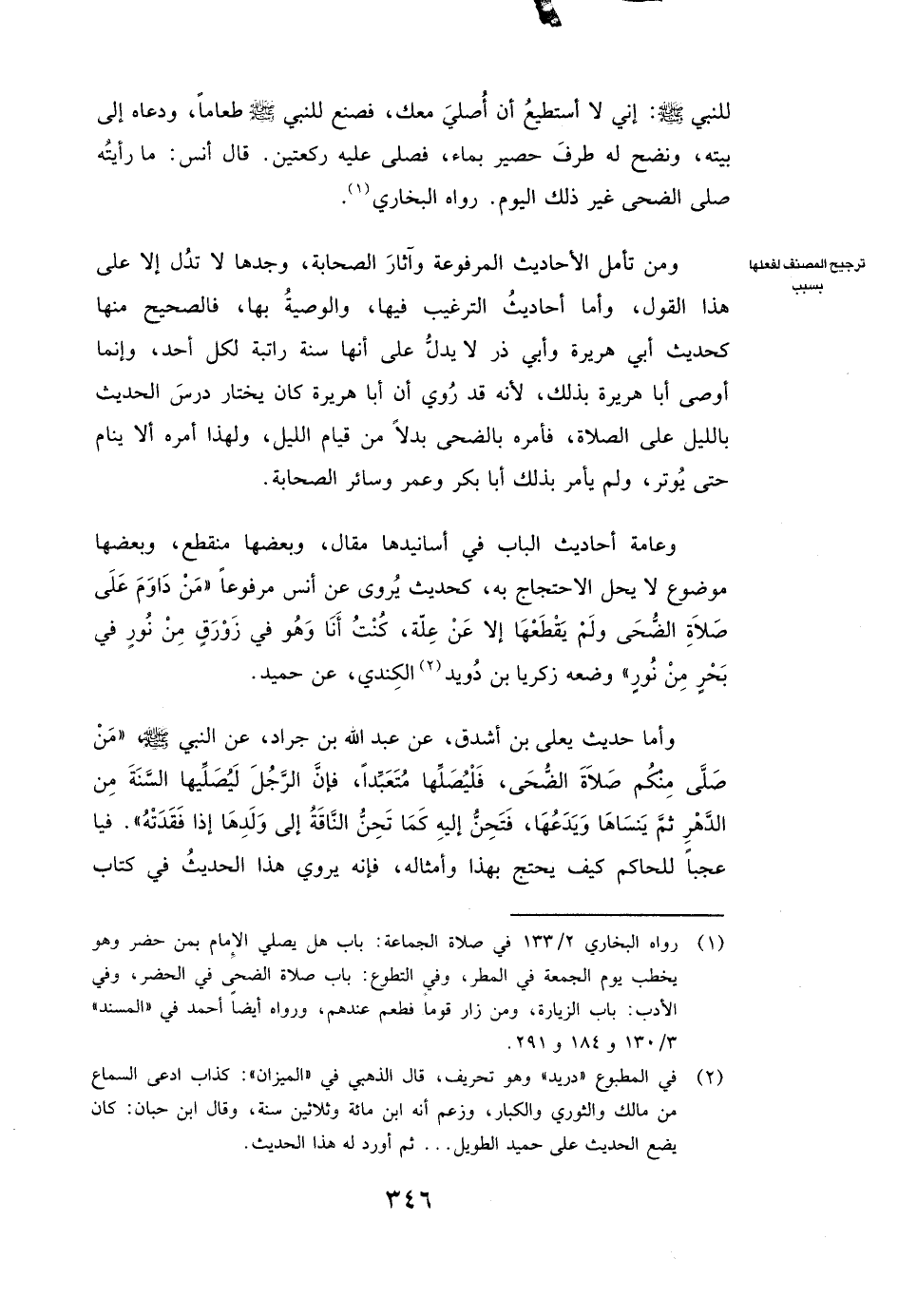 وَمَنْ تَأَمَّلَ الْأَحَادِيثَ الْمَرْفُوعَةَ وَآثَارَ الصَّحَابَةِ، وَجَدَهَا لَا تَدُلُّ إِلَّا عَلَى هَذَا الْقَوْلِ، وَأَمَّا أَحَادِيثُ التَّرْغِيبِ فِيهَا، وَالْوَصِيَّةُ بِهَا، فَالصَّحِيحُ مِنْهَا كَحَدِيثِ أَبِي هُرَيْرَةَ وأبي ذر لَا يَدُلُّ عَلَى أَنَّهَا سُنَّةٌ رَاتِبَةٌ لِكُلِّ أَحَدٍ، وَإِنَّمَا أَوْصَى أَبَا هُرَيْرَةَ بِذَلِكَ، لِأَنَّهُ قَدْ رُوِيَ أَنَّ أَبَا هُرَيْرَةَ كَانَ يَخْتَارُ دَرْسَ الْحَدِيثِ بِاللَّيْلِ عَلَى الصَّلَاةِ، فَأَمَرَهُ بِالضُّحَى بَدَلًا مِنْ قِيَامِ اللَّيْلِ، وَلِهَذَا أَمَرَهُ أَلَّا يَنَامَ حَتَّى يُوتِرَ، وَلَمْ يَأْمُرْ بِذَلِكَ أبا بكر وعمر وَسَائِرَ الصَّحَابَةِ.