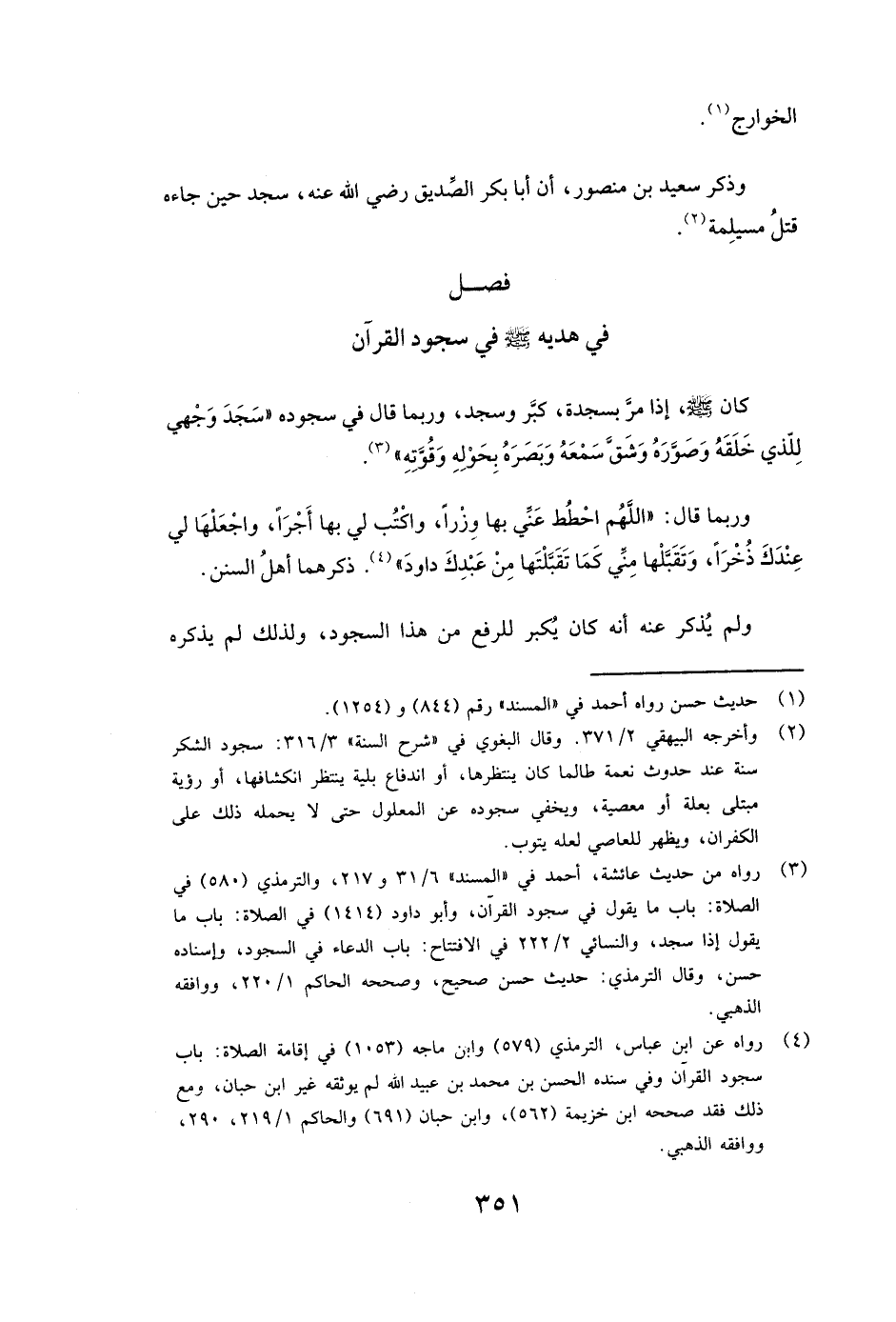 وَذَكَرَ سَعِيدُ بْنُ مَنْصُورٍ (أَنَّ أَبَا بَكْرٍ الصِّدِّيقَ رَضِيَ اللَّهُ عَنْهُ سَجَدَ حِينَ جَاءَهُ قَتْلُ مسيلمة) .