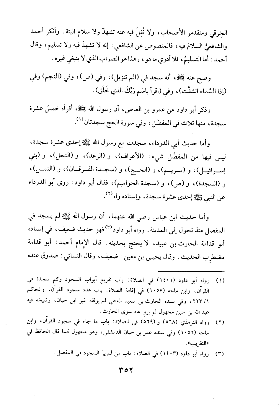 وَأَمَّا حَدِيثُ ابْنِ عَبَّاسٍ رَضِيَ اللَّهُ عَنْهُمَا، أَنَّ رَسُولَ اللَّهِ صَلَّى اللَّهُ عَلَيْهِ وَسَلَّمَ «لَمْ يَسْجُدْ فِي الْمُفَصَّلِ مُنْذُ تَحَوَّلَ إِلَى الْمَدِينَةِ» . رَوَاهُ أبو داود، فَهُوَ حَدِيثٌ ضَعِيفٌ، فِي إِسْنَادِهِ أبو قدامة الحارث بن عبيد، لَا يُحْتَجُّ بِحَدِيثِهِ. قَالَ الْإِمَامُ أَحْمَدُ: أبو قدامة مُضْطَرِبُ الْحَدِيثِ. وَقَالَ يَحْيَى بْنُ مَعِينٍ: ضَعِيفٌ، وَقَالَ النَّسَائِيُّ: صَدُوقٌ عِنْدَهُ