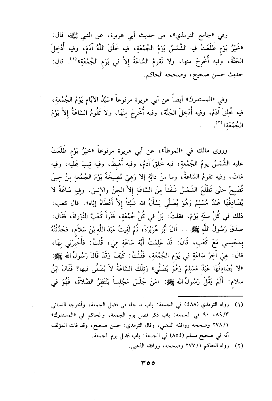 وَرَوَى مالك فِي " الْمُوَطَّأِ " عَنْ أَبِي هُرَيْرَةَ مَرْفُوعًا ( «خَيْرُ يَوْمٍ طَلَعَتْ عَلَيْهِ الشَّمْسُ يَوْمُ الْجُمُعَةِ، فِيهِ خُلِقَ آدَمَ، وَفِيهِ أُهْبِطَ، وَفِيهِ تِيبَ عَلَيْهِ، وَفِيهِ مَاتَ، وَفِيهِ تَقُومُ السَّاعَةُ، وَمَا مِنْ دَابَّةٍ إِلَّا وَهِيَ مُصِيخَةٌ يَوْمَ الْجُمُعَةِ مِنْ حِينِ تُصْبِحُ حَتَّى تَطْلُعَ الشَّمْسُ شَفَقًا مِنَ السَّاعَةِ إِلَّا الْجِنَّ وَالْإِنْسَ، وَفِيهِ سَاعَةٌ لَا يُصَادِفُهَا عَبْدٌ مُسْلِمٌ وَهُوَ يُصَلِّي يَسْأَلُ اللَّهَ شَيْئًا إِلَّا أَعْطَاهُ إِيَّاهُ. قَالَ كعب: ذَلِكَ فِي كُلِّ سَنَةٍ يَوْمٌ، فَقُلْتُ: بَلْ فِي كُلِّ جُمُعَةٍ، فَقَرَأَ كعب التَّوْرَاةَ، فَقَالَ صَدَقَ رَسُولُ اللَّهِ صَلَّى اللَّهُ عَلَيْهِ وَسَلَّمَ. قَالَ أَبُو هَرِيرَةَ: ثُمَّ لَقِيتُ عَبْدَ اللَّهِ بْنَ سَلَامٍ فَحَدَّثْتُهُ بِمَجْلِسِي مَعَ كعب، قَالَ: قَدْ عَلِمْتُ أَيَّةَ سَاعَةٍ هِيَ، قُلْتُ فَأَخْبِرْنِي بِهَا، قَالَ: هِيَ آخِرُ سَاعَةٍ فِي يَوْمِ الْجُمُعَةِ. فَقُلْتُ كَيْفَ وَقَدْ قَالَ رَسُولُ اللَّهِ صَلَّى اللَّهُ عَلَيْهِ وَسَلَّمَ: (لَا يُصَادِفُهَا عَبْدٌ مُسْلِمٌ وَهُوَ يُصَلِّي) وَتِلْكَ السَّاعَةُ لَا يُصَلَّى فِيهَا؟ فَقَالَ ابن سلام: أَلَمْ يَقُلْ رَسُولُ اللَّهِ صَلَّى اللَّهُ عَلَيْهِ وَسَلَّمَ " مَنْ جَلَسَ مَجْلِسًا يَنْتَظِرُ الصَّلَاةَ، فَهُوَ فِي