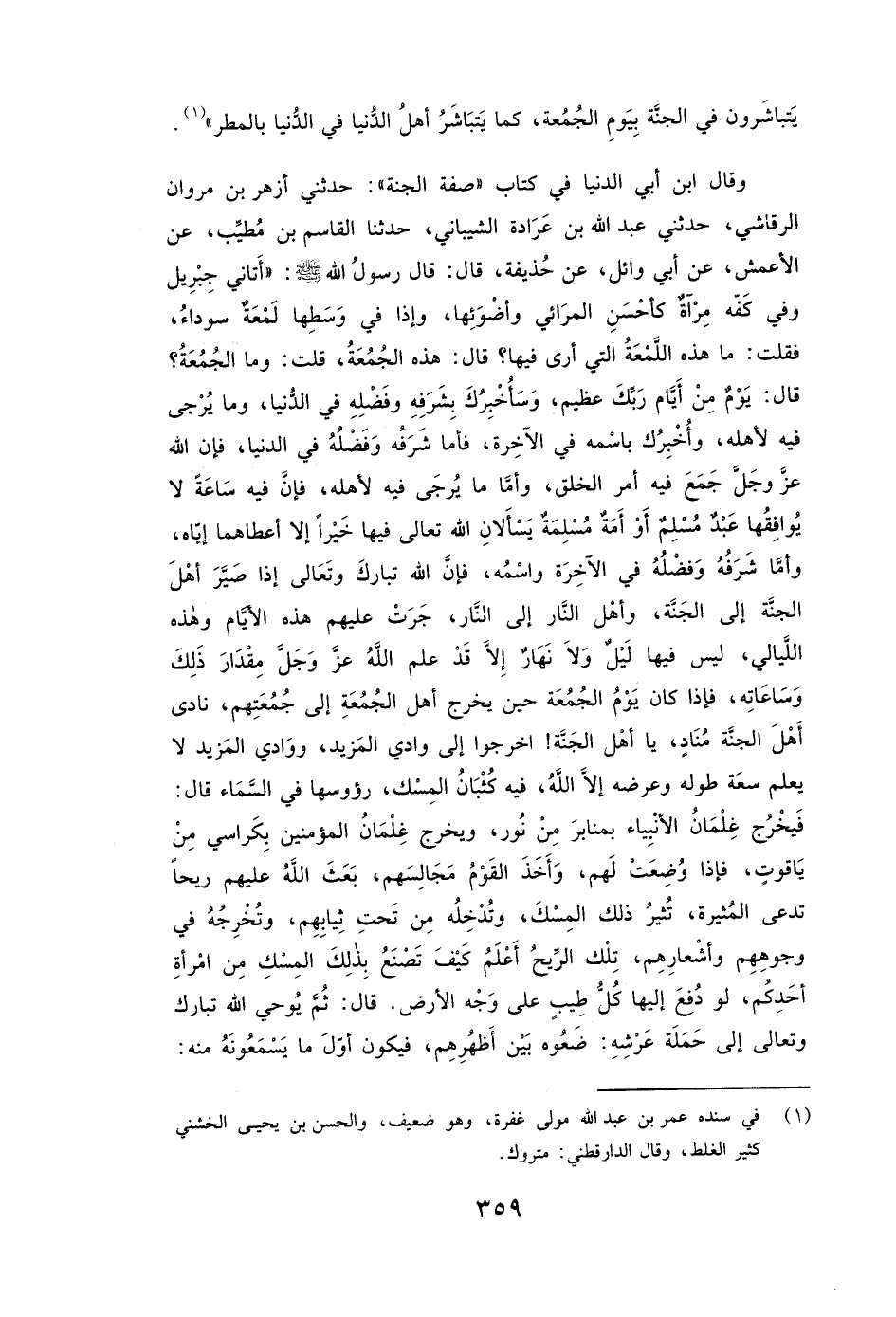 وَقَالَ ابْنُ أَبِي الدُّنْيَا فِي كِتَابِ " صِفَةِ الْجَنَّةِ ": حَدَّثَنِي أزهر بن مروان الرقاشي، حَدَّثَنِي عبد الله بن عرادة الشيباني، حَدَّثَنَا القاسم بن مطيب، عَنِ الْأَعْمَشِ، عَنْ أبي وائل، عَنْ حذيفة، قَالَ: قَالَ رَسُولُ اللَّهِ صَلَّى اللَّهُ عَلَيْهِ وَسَلَّمَ: ( «أَتَانِي جِبْرِيلُ وَفِي كَفِّهِ مِرْآةٌ كَأَحْسَنِ الْمَرَائِي وَأَضْوَئِهَا، وَإِذَا فِي وَسَطِهَا لُمْعَةٌ سَوْدَاءُ، فَقُلْتُ: مَا هَذِهِ اللُّمْعَةُ الَّتِي أَرَى فِيهَا؟ قَالَ هَذِهِ الْجُمُعَةُ، قُلْتُ: وَمَا الْجُمُعَةُ؟ قَالَ يَوْمٌ مِنْ أَيَّامِ رَبِّكَ عَظِيمٌ، وَسَأُخْبِرُكَ بِشَرَفِهِ وَفَضْلِهِ فِي الدُّنْيَا، وَمَا يُرْجَى فِيهِ لِأَهْلِهِ، وَأُخْبِرُكَ بِاسْمِهِ فِي الْآخِرَةِ، فَأَمَّا شَرَفُهُ وَفَضْلُهُ فِي الدُّنْيَا، فَإِنَّ اللَّهَ عَزَّ وَجَلَّ جَمَعَ فِيهِ أَمْرَ الْخَلْقِ، وَأَمَّا مَا يُرْجَى فِيهِ لِأَهْلِهِ، فَإِنَّ فِيهِ سَاعَةً لَا يُوَافِقُهَا عَبْدٌ مُسْلِمٌ أَوْ أَمَةٌ مُسْلِمَةٌ يَسْأَلَانِ اللَّهَ تَعَالَى فِيهَا خَيْرًا إِلَّا أَعْطَاهُمَا إِيَّاهُ، وَأَمَّا شَرَفُهُ وَفَضْلُهُ فِي الْآخِرَةِ وَاسْمُهُ، فَإِنَّ اللَّهَ تَبَارَكَ وَتَعَالَى إِذَا صَيَّرَ أَهْلَ الْجَنَّةِ إِلَى الْجَنَّةِ وَأَهْلَ النَّارِ إِلَى النَّارِ، جَرَتْ عَلَيْهِمْ هَذِهِ الْأَيَّامُ وَهَذِهِ اللَّيَالِي، لَيْسَ فِيهَا لَيْلٌ وَلَا نَهَارٌ إِلَّا قَدْ عَلِمَ اللَّهُ عَزَّ وَجَلَّ مِقْدَارَ ذَلِكَ وَسَاعَاتِهِ، فَإِذَا كَانَ يَوْمُ الْجُمُعَةِ حِينَ يَخْرُجُ أَهْلُ الْجُمُعَةِ إِلَى جُمُعَتِهِمْ، نَادَى أَهْلَ الْجَنَّةِ مُنَادٍ، يَا أَهْلَ الْجَنَّةِ! اخْرُجُوا إِلَى وَادِي الْمَزِيدِ، وَوَادِي الْمَزِيدِ لَا يَعْلَمُ سَعَةَ طُولِهِ وَعَرْضِهِ إِلَّا اللَّهُ، فِيهِ كُثْبَانُ الْمِسْكِ رُؤُوسُهَا فِي السَّمَاءِ قَالَ: فَيَخْرُجُ غِلْمَانُ الْأَنْبِيَاءِ بِمَنَابِرَ مِنْ نُورٍ، وَيَخْرُجُ غِلْمَانُ الْمُؤْمِنِينَ بِكَرَاسِيَّ مِنْ يَاقُوتٍ، فَإِذَا وُضِعَتْ لَهُمْ، وَأَخَذَ الْقَوْمُ مَجَالِسَهُمْ، بَعَثَ اللَّهُ عَلَيْهِمْ رِيحًا تُدْعَى الْمُثِيرَةَ، تُثِيرُ ذَلِكَ الْمِسْكَ، وَتُدْخِلُهُ مِنْ تَحْتِ ثِيَابِهِمْ، وَتُخْرِجُهُ فِي وُجُوهِهِمْ وَأَشْعَارِهِمْ، تِلْكَ الرِّيحُ أَعْلَمُ كَيْفَ تَصْنَعُ بِذَلِكَ الْمِسْكِ مِنِ امْرَأَةِ أَحَدِكُمْ، لَوْ دُفِعَ إِلَيْهَا كُلُّ طِيبٍ عَلَى وَجْهِ الْأَرْضِ. قَالَ: ثُمَّ يُوحِي اللَّهُ تَبَارَكَ وَتَعَالَى إِلَى حَمَلَةِ عَرْشِهِ: ضَعُوهُ بَيْنَ أَظْهُرِهِمْ، فَيَكُونُ أَوَّلَ مَا يَسْمَعُونَهُ مِنْهُ: