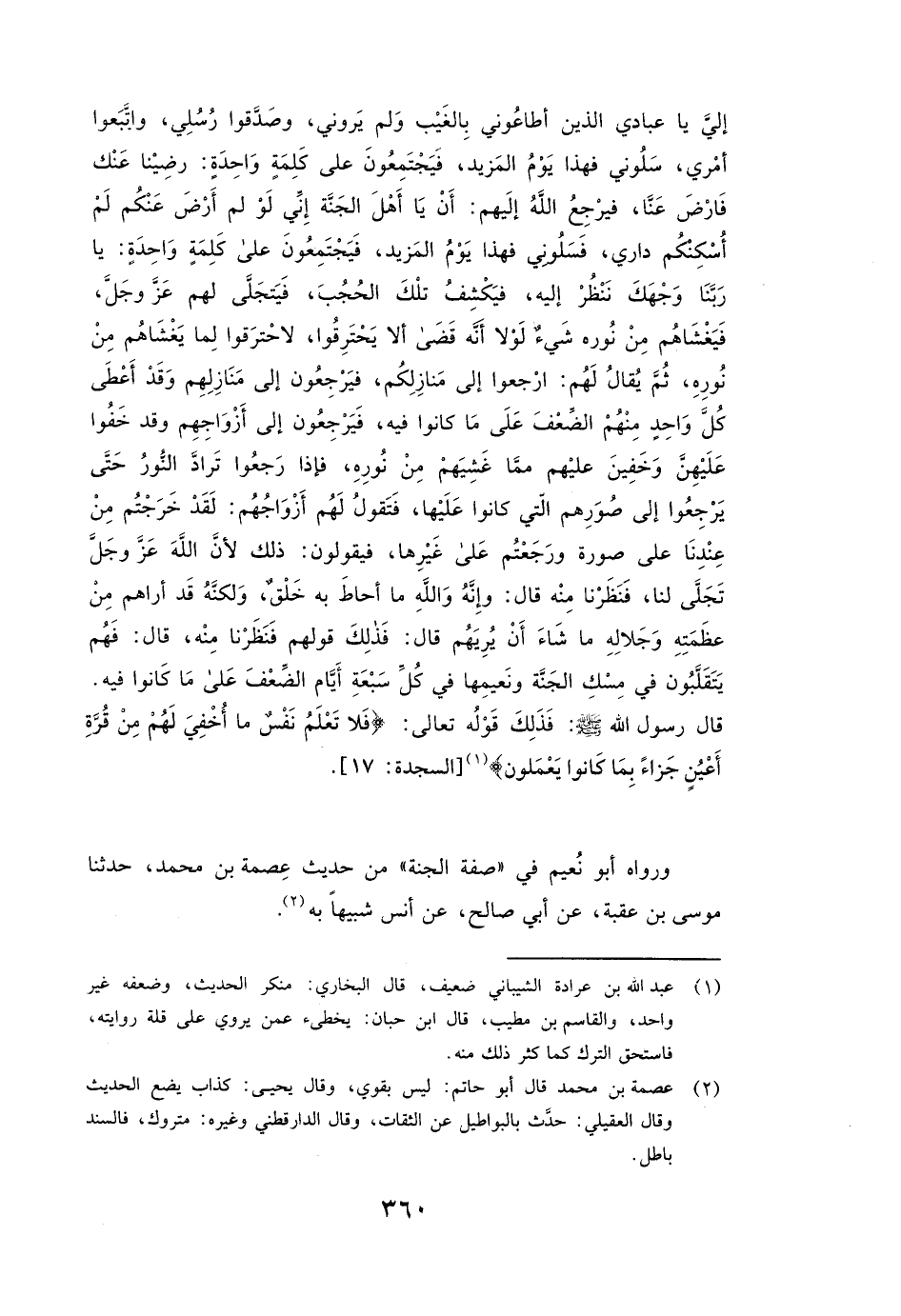 إِلَيَّ يَا عِبَادِي الَّذِينَ أَطَاعُونِي بِالْغَيْبِ وَلَمْ يَرَوْنِي، وَصَدَّقُوا رُسُلِي، وَاتَّبَعُوا أَمْرِي، سَلُونِي فَهَذَا يَوْمُ الْمَزِيدِ، فَيَجْتَمِعُونَ عَلَى كَلِمَةٍ وَاحِدَةٍ: رَضِينَا عَنْكَ فَارْضَ عَنَّا، فَيَرْجِعُ اللَّهُ إِلَيْهِمْ: أَنْ يَا أَهْلَ الْجَنَّةِ إِنِّي لَوْ لَمْ أَرْضَ عَنْكُمْ لَمْ أُسْكِنْكُمْ دَارِي فَسَلُونِي فَهَذَا يَوْمُ الْمَزِيدِ، فَيَجْتَمِعُونَ عَلَى كَلِمَةٍ وَاحِدَةٍ: يَا رَبَّنَا وَجْهَكَ نَنْظُرْ إِلَيْهِ، فَيَكْشِفُ تِلْكَ الْحُجُبَ، فَيَتَجَلَّى لَهُمْ عَزَّ وَجَلَّ فَيَغْشَاهُمْ مِنْ نُورِهِ شَيْءٌ لَوْلَا أَنَّهُ قَضَى أَلَّا يَحْتَرِقُوا لَاحْتَرَقُوا لِمَا يَغْشَاهُمْ مِنْ نُورِهِ، ثُمَّ يُقَالُ لَهُمُ: ارْجِعُوا إِلَى مَنَازِلِكُمْ، فَيَرْجِعُونَ إِلَى مَنَازِلِهِمْ وَقَدْ أَعْطَى كُلَّ وَاحِدٍ مِنْهُمُ الضِّعْفَ عَلَى مَا كَانُوا فِيهِ، فَيَرْجِعُونَ إِلَى أَزْوَاجِهِمْ وَقَدْ خَفُوا عَلَيْهِنَّ وَخَفِينَ عَلَيْهِمْ مِمَّا غَشِيَهُمْ مِنْ نُورِهِ، فَإِذَا رَجَعُوا تَرَادَّ النُّورُ حَتَّى يَرْجِعُوا إِلَى صُوَرِهِمُ الَّتِي كَانُوا عَلَيْهَا، فَتَقُولُ لَهُمْ أَزْوَاجُهُمْ لَقَدْ خَرَجْتُمْ مِنْ عِنْدِنَا عَلَى صُورَةٍ وَرَجَعْتُمْ عَلَى غَيْرِهَا فَيَقُولُونَ: ذَلِكَ لِأَنَّ اللَّهَ عَزَّ وَجَلَّ تَجَلَّى لَنَا فَنَظَرْنَا مِنْهُ , قَالَ وَإِنَّهُ وَاللَّهِ مَا أَحَاطَ بِهِ خَلْقٌ، وَلَكِنَّهُ قَدْ أَرَاهُمْ مِنْ عَظَمَتِهِ وَجَلَالِهِ مَا شَاءَ أَنْ يُرِيَهُمْ، قَالَ: فَذَلِكَ قَوْلُهُمْ فَنَظَرْنَا مِنْهُ، قَالَ: فَهُمْ يَتَقَلَّبُونَ فِي مِسْكِ الْجَنَّةِ وَنَعِيمِهَا فِي كُلِّ سَبْعَةِ أَيَّامٍ الضِّعْفَ عَلَى مَا كَانُوا فِيهِ. قَالَ رَسُولُ اللَّهِ صَلَّى اللَّهُ عَلَيْهِ وَسَلَّمَ فَذَلِكَ قَوْلُهُ تَعَالَى: {فَلَا تَعْلَمُ نَفْسٌ مَا أُخْفِيَ لَهُمْ مِنْ قُرَّةِ أَعْيُنٍ جَزَاءً بِمَا كَانُوا يَعْمَلُونَ} [السجدة: 17] » ) [السَّجْدَةِ: 17] .