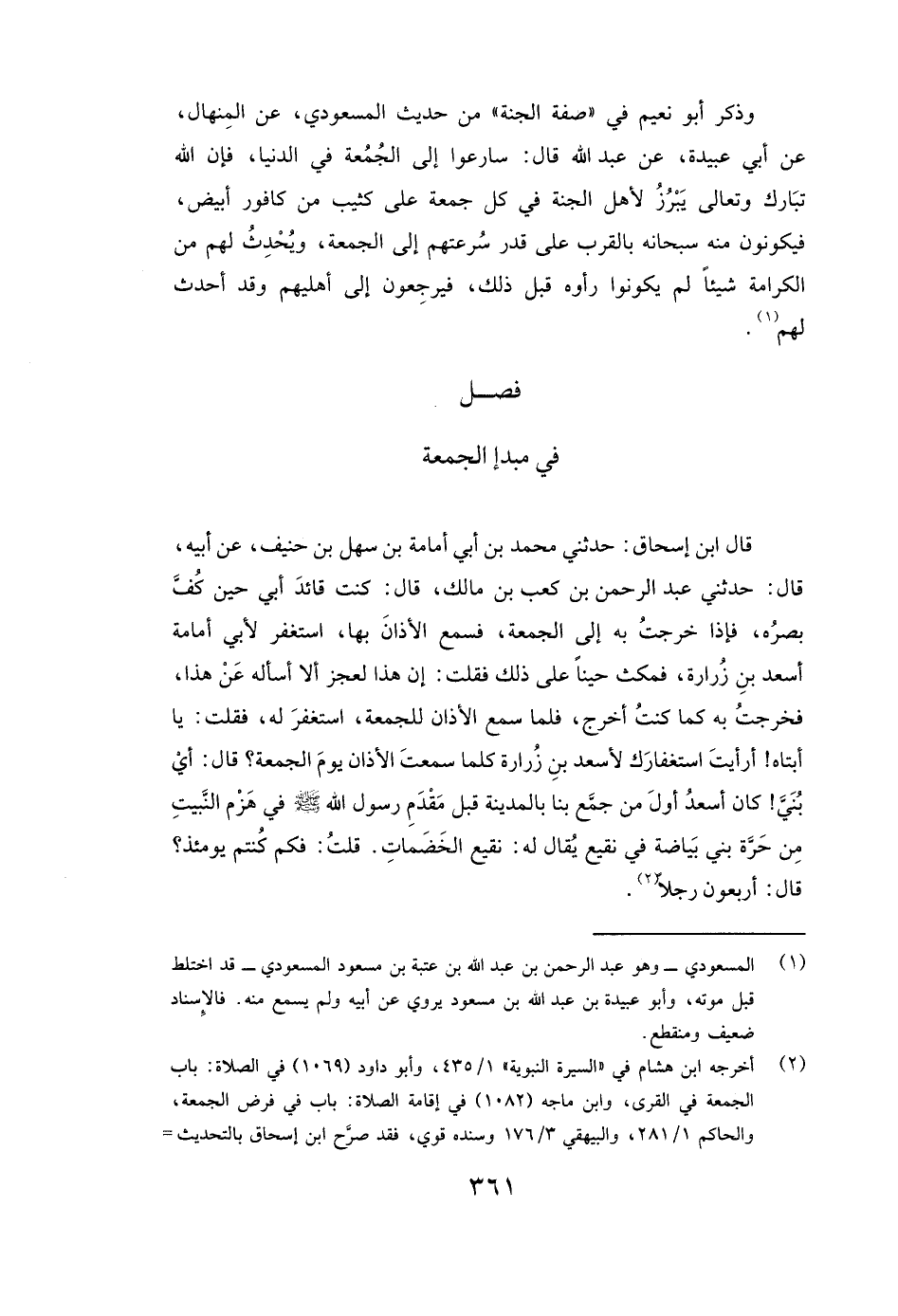 قَالَ ابْنُ إِسْحَاقَ: حَدَّثَنِي محمد بن أبي أمامة بن سهل بن حنيف، عَنْ أَبِيهِ قَالَ: حَدَّثَنِي عبد الرحمن بن كعب بن مالك، قَالَ كُنْتُ قَائِدَ أَبِي حِينَ كُفَّ بَصَرُهُ، فَإِذَا خَرَجْتُ بِهِ إِلَى الْجُمُعَةِ فَسَمِعَ الْأَذَانَ بِهَا اسْتَغْفَرَ لِأَبِي أُمَامَةَ أَسْعَدَ بْنِ زُرَارَةَ، فَمَكَثَ حِينًا عَلَى ذَلِكَ فَقُلْتُ: إِنَّ هَذَا لَعَجْزٌ أَلَا أَسْأَلَهُ عَنْ هَذَا، فَخَرَجْتُ بِهِ كَمَا كُنْتُ أَخْرُجُ، فَلَمَّا سَمِعَ الْأَذَانَ لِلْجُمُعَةِ، اسْتَغْفَرَ لَهُ، فَقُلْتُ: يَا أَبَتَاهُ! أَرَأَيْتَ اسْتِغْفَارَكَ لِأَسْعَدَ بْنِ زُرَارَةَ كُلَّمَا سَمِعْتَ الْأَذَانَ يَوْمَ الْجُمُعَةِ؟ قَالَ: أَيْ بُنَيَّ! كَانَ أسعد أَوَّلَ مَنْ جَمَّعَ بِنَا بِالْمَدِينَةِ قَبْلَ مَقْدَمِ رَسُولِ اللَّهِ صَلَّى اللَّهُ عَلَيْهِ وَسَلَّمَ فِي هَزْمِ النَّبِيتِ مِنْ حَرَّةِ بَنِي بَيَاضَةَ فِي نَقِيعٍ يُقَالُ لَهُ: نَقِيعُ الْخَضَمَاتِ. قُلْتُ: فَكَمْ كُنْتُمْ يَوْمَئِذٍ؟ قَالَ أَرْبَعُونَ رَجُلًا.