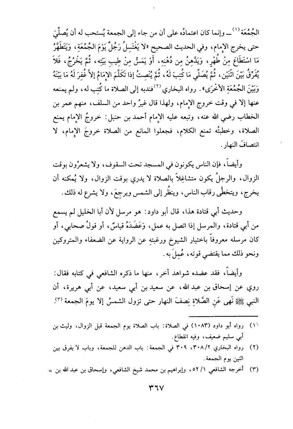 الْجُمُعَةِ» ) - وَإِنَّمَا كَانَ اعْتِمَادُهُ عَلَى أَنَّ مَنْ جَاءَ إِلَى الْجُمُعَةِ يُسْتَحَبُّ لَهُ أَنْ يُصَلِّيَ حَتَّى يَخْرُجَ الْإِمَامُ، وَفِي الْحَدِيثِ الصَّحِيحِ ( «لَا يَغْتَسِلُ رَجُلٌ يَوْمَ الْجُمُعَةِ وَيَتَطَهَّرُ مَا اسْتَطَاعَ مِنْ طُهْرٍ، وَيَدَّهِنُ مِنْ دُهْنِهِ، أَوْ يَمَسُّ مِنْ طِيبِ بَيْتِهِ، ثُمَّ يَخْرُجُ، فَلَا يُفَرِّقُ بَيْنَ اثْنَيْنِ، ثُمَّ يُصَلِّي مَا كُتِبَ لَهُ، ثُمَّ يُنْصِتُ إِذَا تَكَلَّمَ الْإِمَامُ إِلَّا غُفِرَ لَهُ مَا بَيْنَهُ وَبَيْنَ الْجُمُعَةِ الْأُخْرَى» ) رَوَاهُ الْبُخَارِيُّ، فَنَدَبَهُ إِلَى الصَّلَاةِ مَا كُتِبَ لَهُ، وَلَمْ يَمْنَعْهُ عَنْهَا إِلَّا فِي وَقْتِ خُرُوجِ الْإِمَامِ، وَلِهَذَا قَالَ غَيْرُ وَاحِدٍ مِنَ السَّلَفِ، مِنْهُمْ عُمَرُ بْنُ الْخَطَّابِ رَضِيَ اللَّهُ عَنْهُ، وَتَبِعَهُ عَلَيْهِ الْإِمَامُ أَحْمَدُ بْنُ حَنْبَلٍ: خُرُوجُ الْإِمَامِ يَمْنَعُ الصَّلَاةَ وَخُطْبَتُهُ تَمْنَعُ الْكَلَامَ، فَجَعَلُوا الْمَانِعَ مِنَ الصَّلَاةِ خُرُوجَ الْإِمَامِ لَا انْتِصَافَ النَّهَارِ.