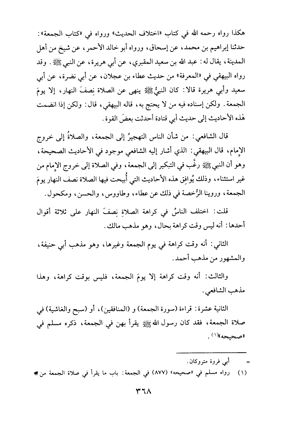 قَالَ الشَّافِعِيُّ: مِنْ شَأْنِ النَّاسِ التَّهْجِيرُ إِلَى الْجُمُعَةِ وَالصَّلَاةُ إِلَى خُرُوجِ الْإِمَامِ، قَالَ البيهقي: الَّذِي أَشَارَ إِلَيْهِ الشَّافِعِيُّ مَوْجُودٌ فِي الْأَحَادِيثِ الصَّحِيحَةِ، وَهُوَ أَنَّ النَّبِيَّ صَلَّى اللَّهُ عَلَيْهِ وَسَلَّمَ رَغَّبَ فِي التَّبْكِيرِ إِلَى الْجُمُعَةِ، وَفِي الصَّلَاةِ إِلَى خُرُوجِ الْإِمَامِ مِنْ غَيْرِ اسْتِثْنَاءٍ، وَذَلِكَ يُوَافِقُ هَذِهِ الْأَحَادِيثَ الَّتِي أُبِيحَتْ فِيهَا الصَّلَاةُ نِصْفَ النَّهَارِ يَوْمَ الْجُمُعَةِ، وَرُوِّينَا الرُّخْصَةَ فِي ذَلِكَ عَنْ عَطَاءٍ وَطَاوُوسٍ وَالْحَسَنِ وَمَكْحُولٍ.
