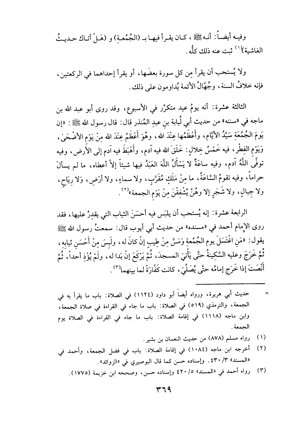 وَفِيهِ أَيْضًا: أَنَّهُ صَلَّى اللَّهُ عَلَيْهِ وَسَلَّمَ كَانَ يَقْرَأُ فِيهَا بِ (الْجُمُعَةِ) وَ {هَلْ أَتَاكَ حَدِيثُ الْغَاشِيَةِ} [الغاشية: 1] ثَبَتَ عَنْهُ ذَلِكَ كُلُّهُ.