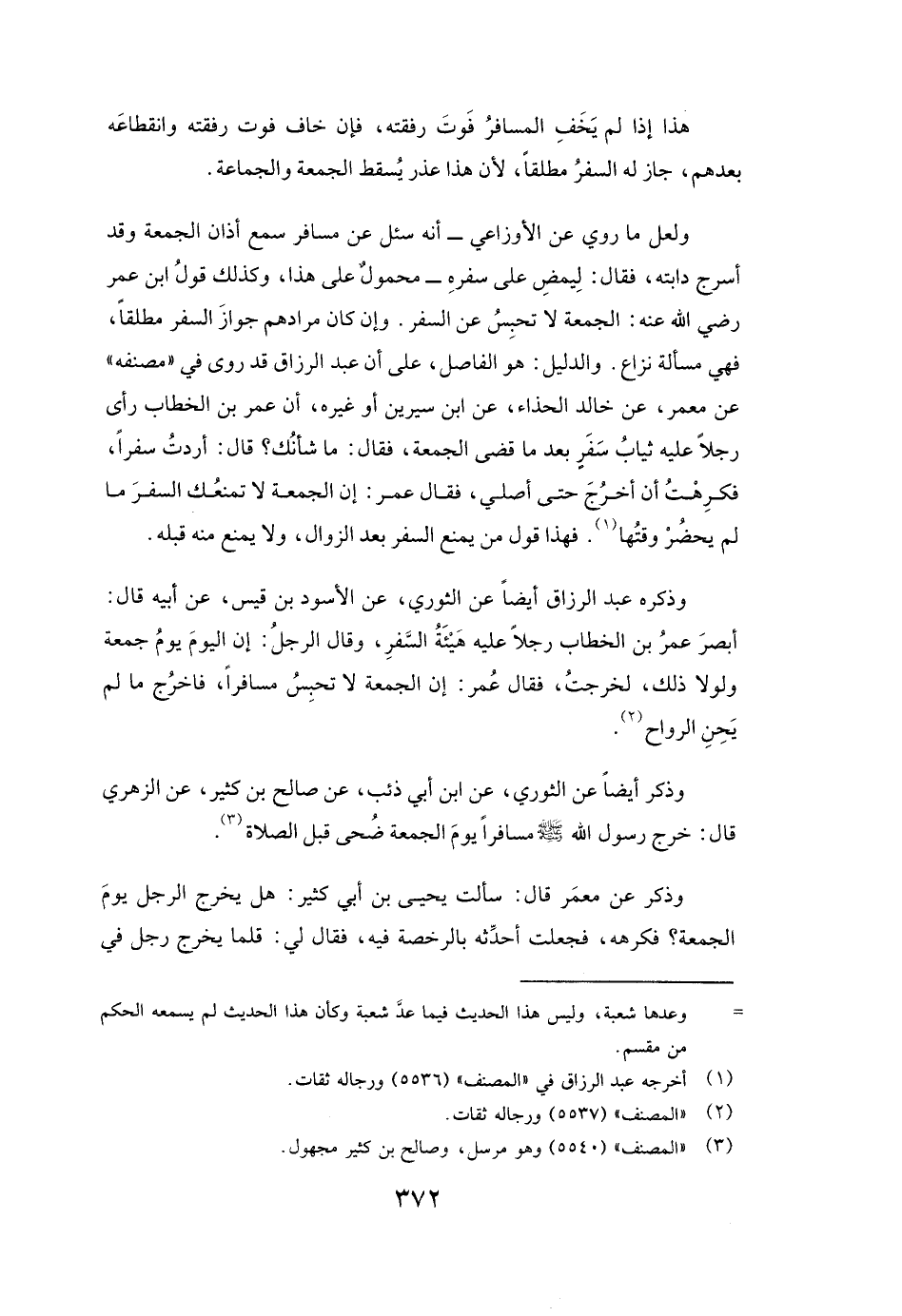 وَإِنْ كَانَ مُرَادُهُمْ جَوَازَ السَّفَرِ مُطْلَقًا فَهِيَ مَسْأَلَةُ نِزَاعٍ. وَالدَّلِيلُ: هُوَ الْفَاصِلُ عَلَى أَنَّ عبد الرزاق قَدْ رَوَى فِي " مُصَنَّفِهِ " عَنْ معمر عَنْ خَالِدٍ الْحَذَّاءِ عَنِ ابْنِ سِيرِينَ أَوْ غَيْرِهِ (أَنَّ عُمَرَ بْنَ الْخَطَّابِ رَأَى رَجُلًا عَلَيْهِ ثِيَابُ سَفَرٍ بَعْدَ مَا قَضَى الْجُمُعَةَ، فَقَالَ: مَا شَأْنُكَ؟ قَالَ: أَرَدْتُ سَفَرًا فَكَرِهْتُ أَنْ أَخْرُجَ حَتَّى أُصَلِّيَ، فَقَالَ عُمَرُ: إِنَّ الْجُمُعَةَ لَا تَمْنَعُكَ السَّفَرَ مَا لَمْ يَحْضُرْ وَقْتُهَا) فَهَذَا قَوْلُ مَنْ يَمْنَعُ السَّفَرَ بَعْدَ الزَّوَالِ وَلَا يَمْنَعُ مِنْهُ قَبْلَهُ.