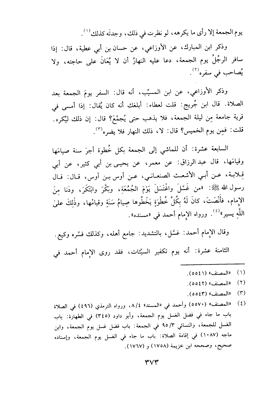 السَّابِعَةَ عَشْرَةَ: أَنَّ لِلْمَاشِي إِلَى الْجُمُعَةِ بِكُلِّ خُطْوَةٍ أَجْرَ سَنَةٍ صِيَامَهَا وَقِيَامَهَا، قَالَ عبد الرزاق: عَنْ معمر عَنْ يَحْيَى بْنِ أَبِي كَثِيرٍ، عَنْ أبي قلابة عَنْ أَبِي الْأَشْعَثِ الصَّنْعَانِيِّ، عَنْ أوس بن أوس قَالَ: قَالَ رَسُولُ اللَّهِ صَلَّى اللَّهُ عَلَيْهِ وَسَلَّمَ: ( «مَنْ غَسَّلَ وَاغْتَسَلَ يَوْمَ الْجُمُعَةِ، وَبَكَّرَ وَابْتَكَرَ، وَدَنَا مِنَ الْإِمَامِ فَأَنْصَتَ، كَانَ لَهُ بِكُلِّ خُطْوَةٍ يَخْطُوهَا صِيَامُ سَنَةٍ وَقِيَامُهَا وَذَلِكَ عَلَى اللَّهِ يَسِيرٌ» ) . وَرَوَاهُ الْإِمَامُ أَحْمَدُ فِي " مُسْنَدِهِ ".