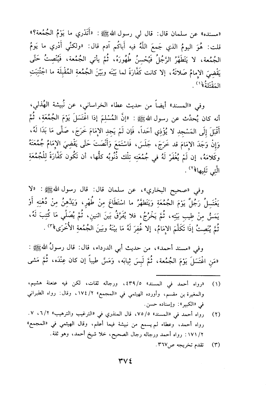 " مُسْنَدِهِ " «عَنْ سلمان قَالَ: قَالَ لِي رَسُولُ اللَّهُ صَلَّى اللَّهُ عَلَيْهِ وَسَلَّمَ: " أَتَدْرِي مَا يَوْمُ الْجُمُعَةِ؟ " قُلْتُ: هُوَ الْيَوْمُ الَّذِي جَمَعَ اللَّهُ فِيهِ أَبَاكُمْ آدَمَ قَالَ: " وَلَكِنِّي أَدْرِي مَا يَوْمُ الْجُمُعَةِ، لَا يَتَطَهَّرُ الرَّجُلُ فَيُحْسِنُ طُهُورَهُ، ثُمَّ يَأْتِي الْجُمُعَةَ فَيُنْصِتُ حَتَّى يَقْضِيَ الْإِمَامُ صَلَاتَهُ، إِلَّا كَانَتْ كَفَّارَةً لِمَا بَيْنَهُ وَبَيْنَ الْجُمُعَةِ الْمُقْبِلَةِ مَا اجْتُنِبَتِ الْمَقْتَلَةُ» .