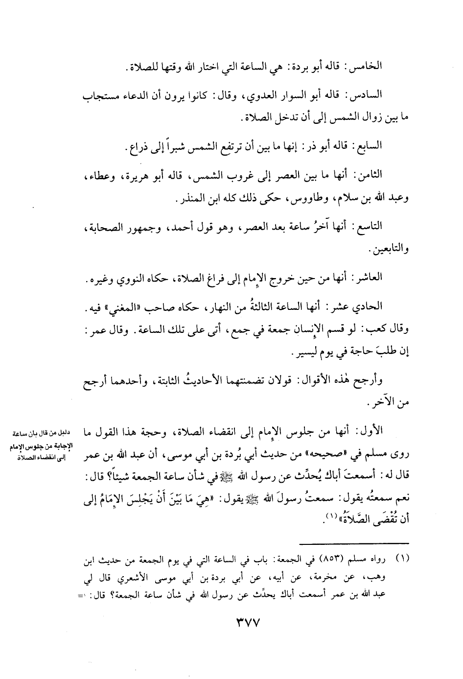 الْأَوَّلُ: أَنَّهَا مِنْ جُلُوسِ الْإِمَامِ إِلَى انْقِضَاءِ الصَّلَاةِ، وَحُجَّةُ هَذَا الْقَوْلِ مَا رَوَى مسلم فِي " صَحِيحِهِ " مِنْ حَدِيثِ أَبِي بُرْدَةَ بْنِ أَبِي مُوسَى، «أَنَّ عبد الله بن عمر قَالَ لَهُ: أَسَمِعْتَ أَبَاكَ يُحَدِّثُ عَنْ رَسُولِ اللَّهِ صَلَّى اللَّهُ عَلَيْهِ وَسَلَّمَ فِي شَأْنِ سَاعَةِ الْجُمُعَةِ شَيْئًا؟ قَالَ: نَعَمْ سَمِعْتُهُ يَقُولُ: سَمِعْتُ رَسُولَ اللَّهِ صَلَّى اللَّهُ عَلَيْهِ وَسَلَّمَ يَقُولُ: " هِيَ مَا بَيْنَ أَنْ يَجْلِسَ الْإِمَامُ إِلَى أَنْ تُقْضَى الصَّلَاةُ» ".