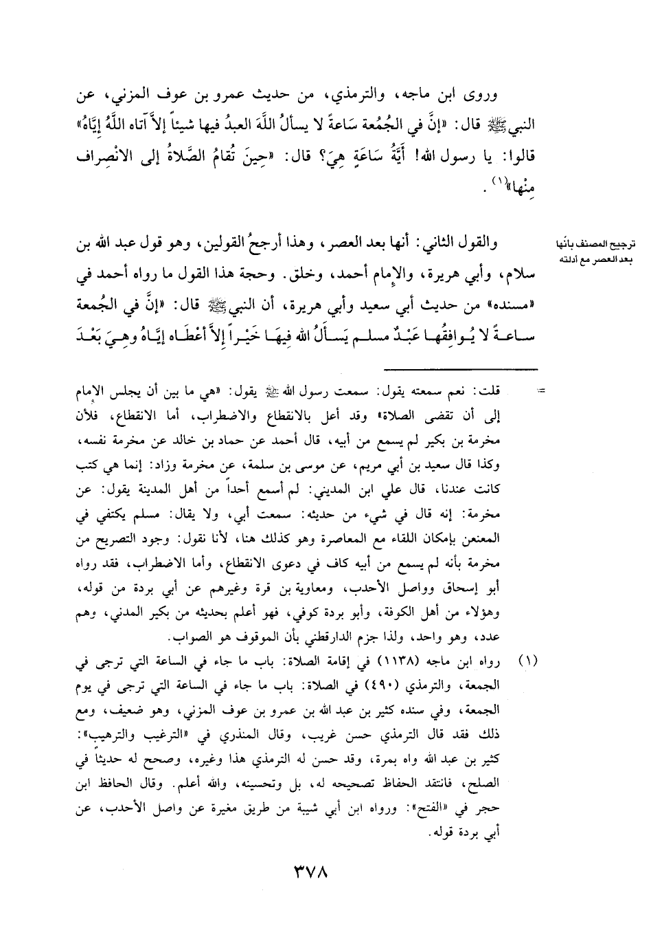 وَالْقَوْلُ الثَّانِي: أَنَّهَا بَعْدَ الْعَصْرِ، وَهَذَا أَرْجَحُ الْقَوْلَيْنِ وَهُوَ قَوْلُ عَبْدِ اللَّهِ بْنِ سَلَامٍ، وَأَبِي هُرَيْرَةَ وَالْإِمَامِ أَحْمَدَ وَخَلْقٍ. وَحُجَّةُ هَذَا الْقَوْلِ مَا رَوَاهُ أحمد فِي " مُسْنَدِهِ " مِنْ حَدِيثِ أبي سعيد وَأَبِي هُرَيْرَةَ أَنَّ النَّبِيَّ صَلَّى اللَّهُ عَلَيْهِ وَسَلَّمَ قَالَ: " «إِنَّ فِي الْجُمُعَةِ سَاعَةً لَا يُوَافِقُهَا عَبْدٌ مُسْلِمٌ يَسْأَلُ اللَّهَ فِيهَا خَيْرًا إِلَّا أَعْطَاهُ إِيَّاهُ وَهِيَ بَعْدَ