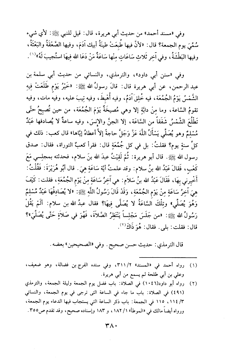 وَفِي " سُنَنِ أبي داود " وَالتِّرْمِذِيِّ وَالنَّسَائِيِّ مِنْ حَدِيثِ أَبِي سَلَمَةَ بْنِ عَبْدِ الرَّحْمَنِ عَنْ أَبِي هُرَيْرَةَ قَالَ: قَالَ رَسُولُ اللَّهِ صَلَّى اللَّهُ عَلَيْهِ وَسَلَّمَ: " «خَيْرُ يَوْمٍ طَلَعَتْ فِيهِ الشَّمْسُ يَوْمُ الْجُمُعَةِ؛ فِيهِ خُلِقَ آدَمُ وَفِيهِ أُهْبِطَ وَفِيهِ تِيبَ عَلَيْهِ وَفِيهِ مَاتَ وَفِيهِ تَقُومُ السَّاعَةُ، وَمَا مِنْ دَابَّةٍ إِلَّا وَهِيَ مُصِيخَةٌ يَوْمَ الْجُمُعَةِ مِنْ حِينِ تُصْبِحُ حَتَّى تَطْلُعَ الشَّمْسُ شَفَقًا مِنَ السَّاعَةِ إِلَّا الْجِنَّ وَالْإِنْسَ، وَفِيهِ سَاعَةٌ لَا يُصَادِفُهَا عَبْدٌ مُسْلِمٌ وَهُوَ يُصَلِّي يَسْأَلُ اللَّهَ عَزَّ وَجَلَّ حَاجَةً إِلَّا أَعْطَاهُ إِيَّاهَا» " قَالَ كعب: ذَلِكَ فِي كُلِّ سَنَةٍ يَوْمٌ؟ فَقُلْتُ: بَلْ فِي كُلِّ جُمُعَةٍ قَالَ: فَقَرَأَ كعب التَّوْرَاةَ فَقَالَ: صَدَقَ رَسُولُ اللَّهِ صَلَّى اللَّهُ عَلَيْهِ وَسَلَّمَ. قَالَ أَبُو هُرَيْرَةَ: ثُمَّ لَقِيتُ عَبْدَ اللَّهِ بْنَ سَلَامٍ فَحَدَّثْتُهُ بِمَجْلِسِي مَعَ كعب فَقَالَ عَبْدُ اللَّهِ بْنُ سَلَامٍ: وَقَدْ عَلِمْتُ أَيَّةَ سَاعَةٍ هِيَ. قَالَ أَبُو هُرَيْرَةَ: فَقُلْتُ أَخْبِرْنِي بِهَا، فَقَالَ عَبْدُ اللَّهِ بْنُ سَلَامٍ: هِيَ آخِرُ سَاعَةٍ مِنْ يَوْمِ الْجُمُعَةِ، فَقُلْتُ: كَيْفَ هِيَ آخِرُ سَاعَةٍ مِنْ يَوْمِ الْجُمُعَةِ وَقَدْ قَالَ رَسُولُ اللَّهِ صَلَّى اللَّهُ عَلَيْهِ وَسَلَّمَ: " «لَا يُصَادِفُهَا عَبْدٌ مُسْلِمٌ وَهُوَ يُصَلِّي» " وَتِلْكَ السَّاعَةُ لَا يُصَلَّى فِيهَا؟ فَقَالَ عَبْدُ اللَّهِ بْنُ سَلَامٍ: أَلَمْ يَقُلْ رَسُولُ اللَّهِ صَلَّى اللَّهُ عَلَيْهِ وَسَلَّمَ " «مَنْ جَلَسَ مَجْلِسًا يَنْتَظِرُ الصَّلَاةَ فَهُوَ فِي صَلَاةٍ حَتَّى يُصَلِّيَ» "؟ قَالَ: فَقُلْتُ: بَلَى. فَقَالَ: هُوَ ذَاكَ.