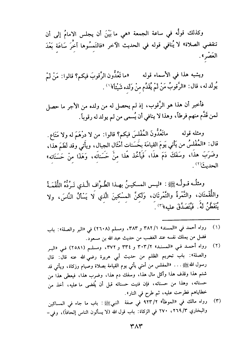 وَمِثْلُهُ قَوْلُهُ صَلَّى اللَّهُ عَلَيْهِ وَسَلَّمَ «مَا تَعُدُّونَ الْمُفْلِسَ فِيكُمْ؟ قَالُوا: مَنْ لَا دِرْهَمَ لَهُ وَلَا مَتَاعَ. قَالَ " الْمُفْلِسُ مَنْ يَأْتِي يَوْمَ الْقِيَامَةِ بِحَسَنَاتٍ أَمْثَالِ الْجِبَالِ، وَيَأْتِي وَقَدْ لَطَمَ هَذَا، وَضَرَبَ هَذَا وَسَفَكَ دَمَ هَذَا، فَيَأْخُذُ هَذَا مِنْ حَسَنَاتِهِ وَهَذَا مِنْ حَسَنَاتِهِ» " الْحَدِيثَ.